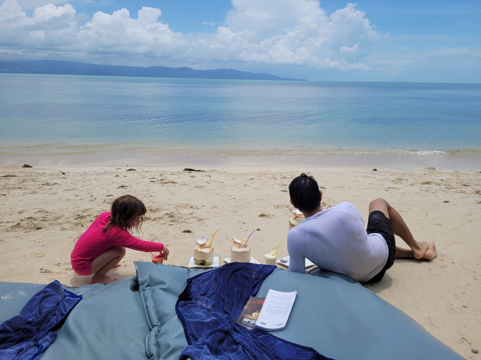 אוסיף ואומר שהחופשה שלנו בקופנגן שונה משל הרבה אנשים, הרוב משלבים את החופים והמלונות עם טיולים ואטרקציות באי. החופשה שלנו לא כוללת בכלל טיולים ואטרקציות. כיוון שהשגרה שלנו בארץ היא כל כך לא שגרתית, היא מלאה בעשייה, נסיעות, בילויים, אטרקציות, טיולים, וכל בוקר מתחיל בלבשל ולארוז אוכל וציוד ליום שלם ובכל יום הילדות מצפות לחוויה חדשה, לתאילנד אני טסה כדי לקבל את ההיפך, לקבל את הפשטות הזו של לקום בבוקר בלי המירוץ, בלי להספיק כלום, בלי לעבוד, בלי לשאול מה עושים היום ומה מחר. בכל יום מה שעושים זה: ים, בריכה, טיולים על החוף, משחקים בחול, מסאז'ים, קריאת ספרים, אוכל, שייקים. הדבר היחיד שמגוון זה הסדר, פעם מתחילים בים ופעם בבריכה.