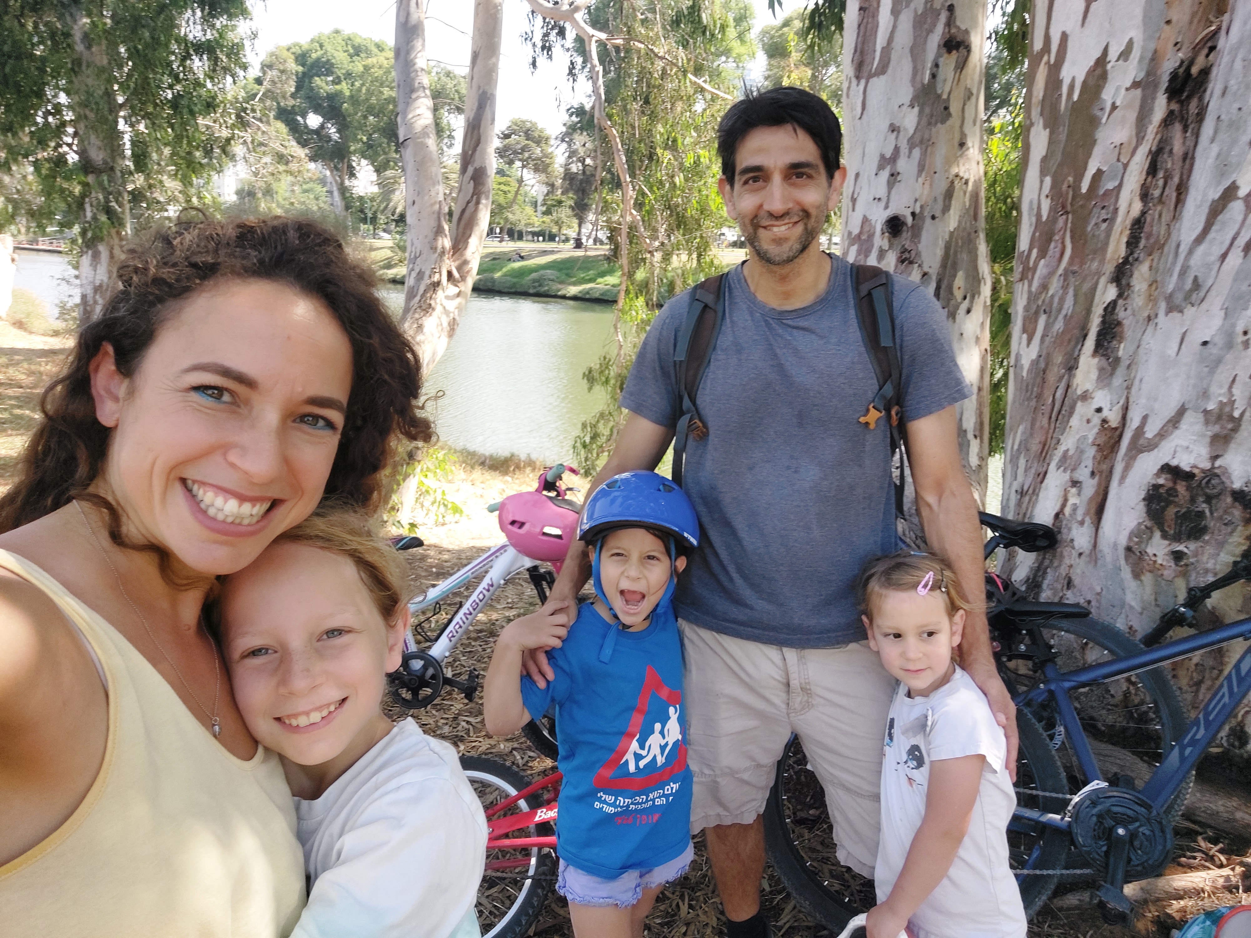 לא מזמן אורי ביקשה מפיית השיניים לרכב כולנו יחד באופניים בפארק הירקון. לאורי ואלה יש אופניים מוצלחים והן יכולות לרכב עצמאית, אבל לי ולגיא אין אופניים ולירי לא יכולה לרכב לבד במשך זמן רב, לכן החלטנו לשכור אופניים. פנינו לסטארבייקס שנמצאים ממש על פארק הירקון באזור רמת החייל (רחוב הברזל 2, תל אביב) והגענו בבוקר לפני ערב חג. לגיא התאימו אופני יחיד ולי וללירי אופניים מחוברות, לירי עם חצי אופניים מחוברים לשלי מאחורה, הם מספקים גם קסדות.