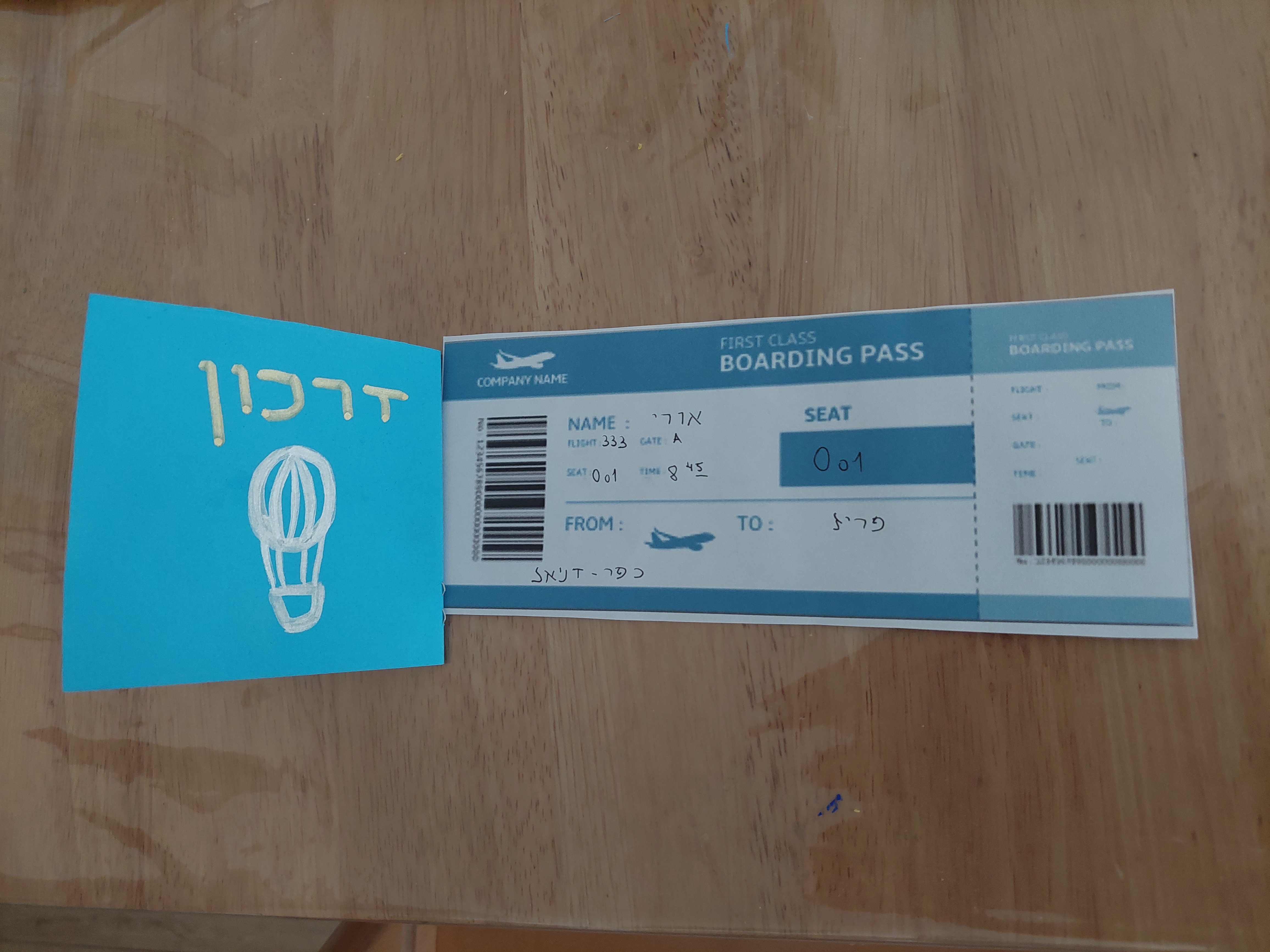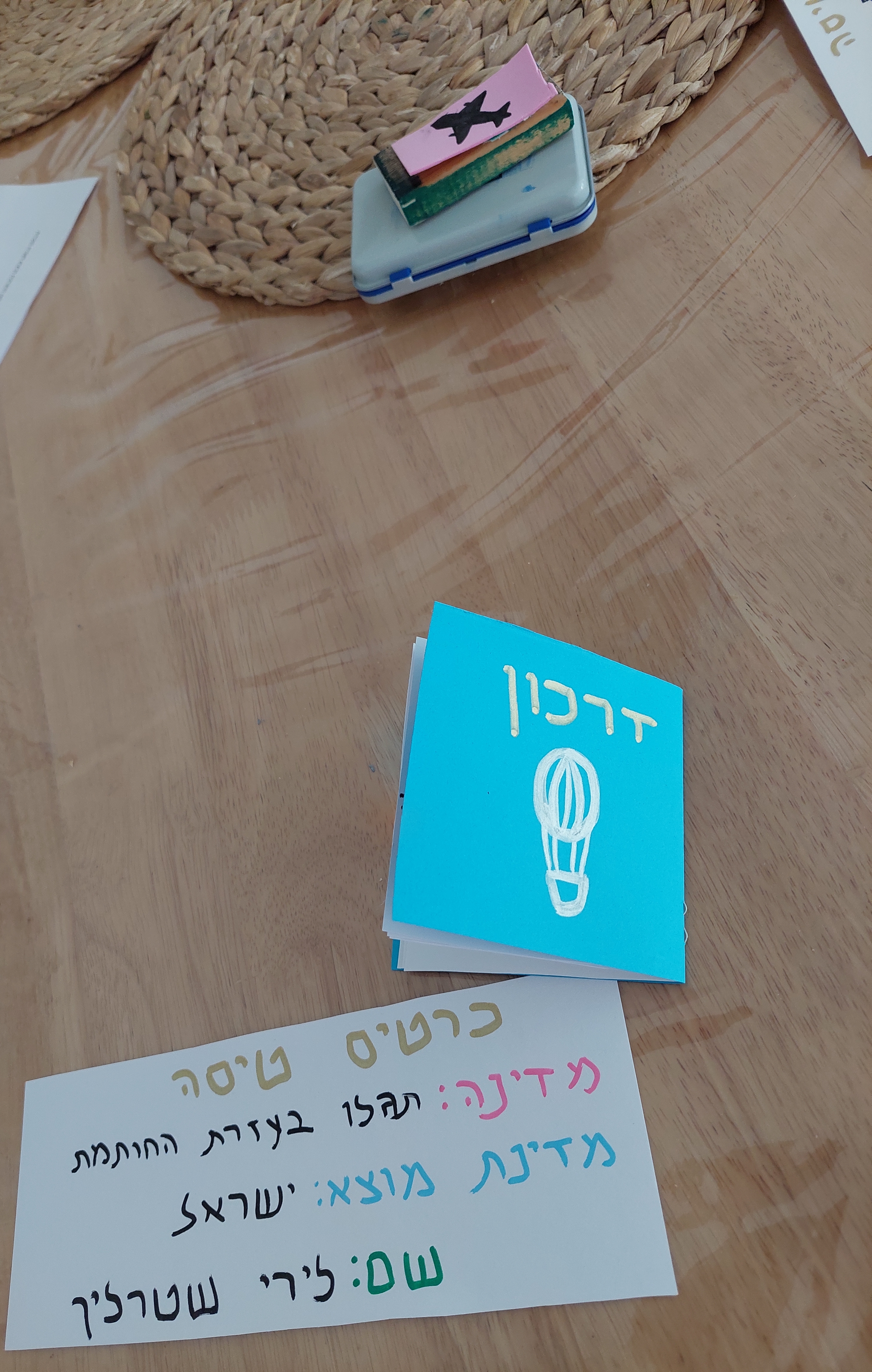 ביום הראשון הן קיבלו "דרכון" שהכנתי מבריסטולים לכל אחת ובכל יום חיכתה להן חותמת עם שם המדינה שכשהחתימו בדרכון גילו לאן הן טסות וכרטיס טיסה ללא שם המדינה. מאוד קל לעשות את החותמות האלה לבד, לוקחים דף סול, דיו לחותמות (יש בחנויות כלי כתיבה וכו') וחתיכת עץ קטנה, מדביקים את הסול על חתיכת העץ וכותבים חזק בעיפרון את שם המדינה בכתב מראה ככה שהכתוב יהיה חרוט ואז כשמחתימים זה בעצם משאיר את שם המדינה לבן ואת הרקע בצבע, בכל יום הדבקתי על הסול עוד שכבה של סול עם שם המדינה החדשה.