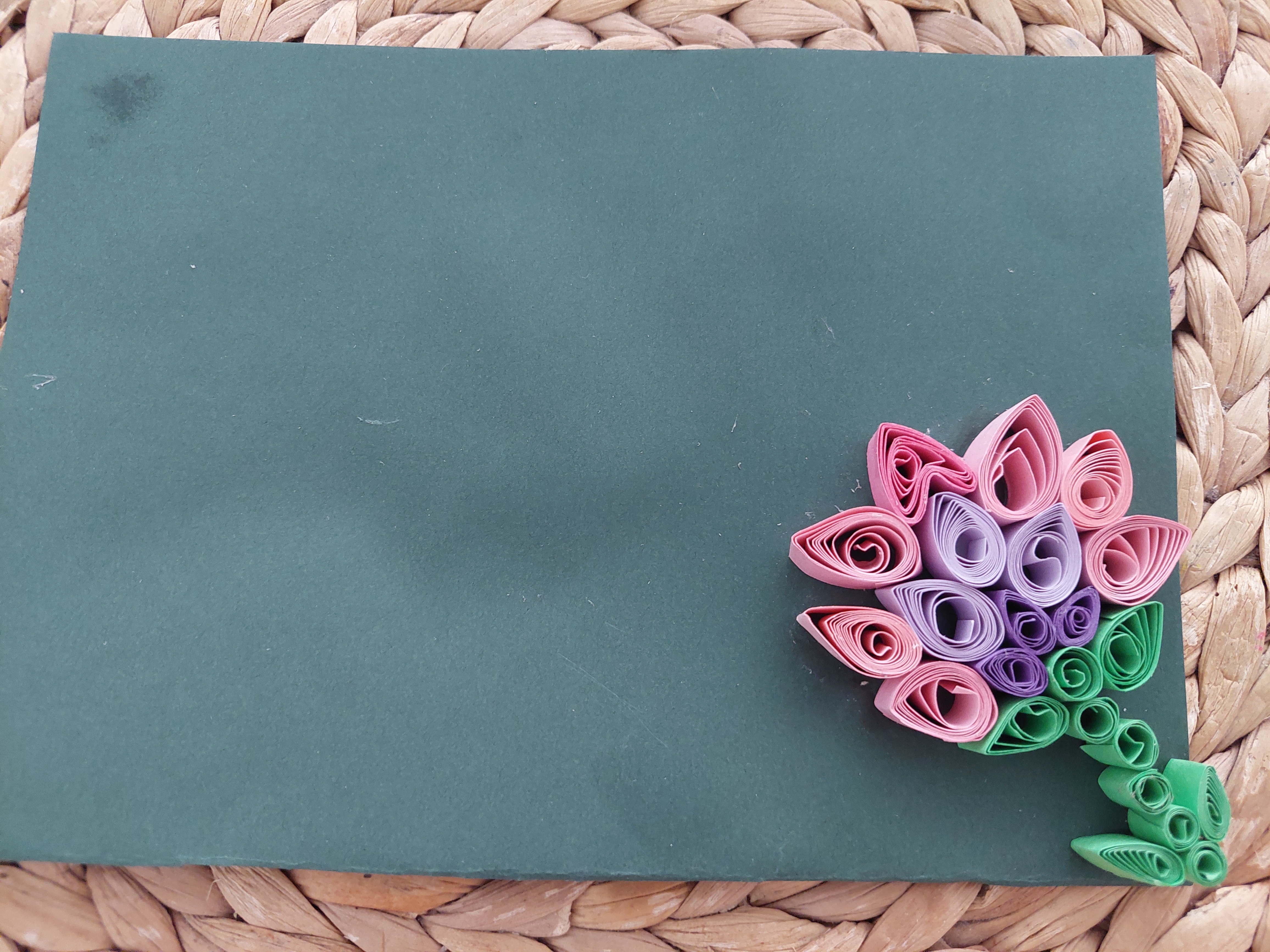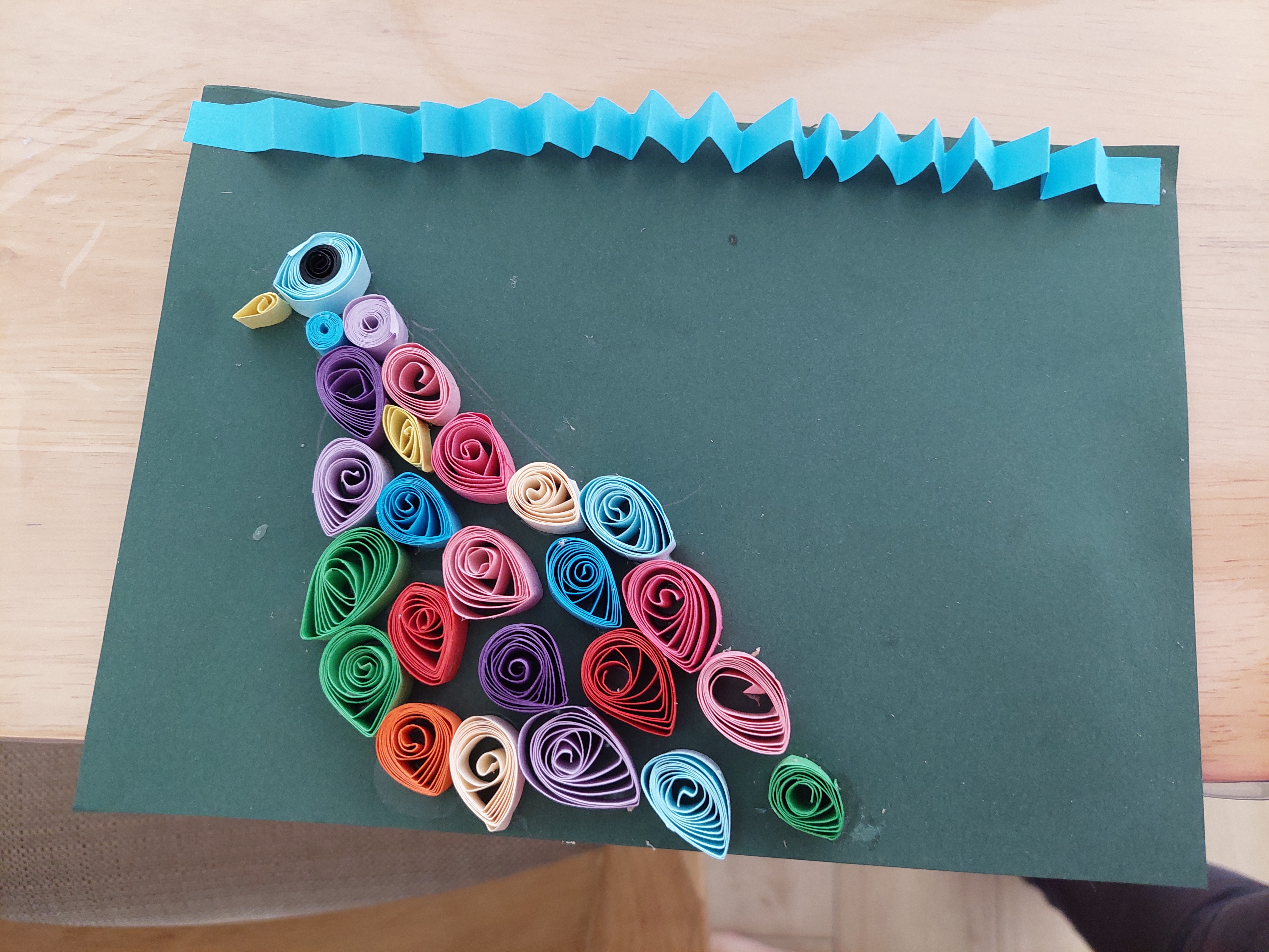 לאחר מכן, עשינו יצירה – קווילינג, אומנות הקווילינג פותחה באיטליה. קווילינג זו יצירה מניירות דקים וצבעוניים שמגלגלים ומדביקים אותם על בריסטול בצורות שונות ויוצרים ציור יפיפה. את הניירות לקווילינג קניתי מראש, יחד עם מכשיר שעליו מלפפים את הניירות (אפשר גם לעשות כזה לבד משיפוד. אלה השקיעה בזה זמן רב, אורי ולירי איבדו עניין דיי מהר ולכן נתתי להן מקלות רופא וקופסאות נעליים והן בנו לעצמן טירות מקסימות.