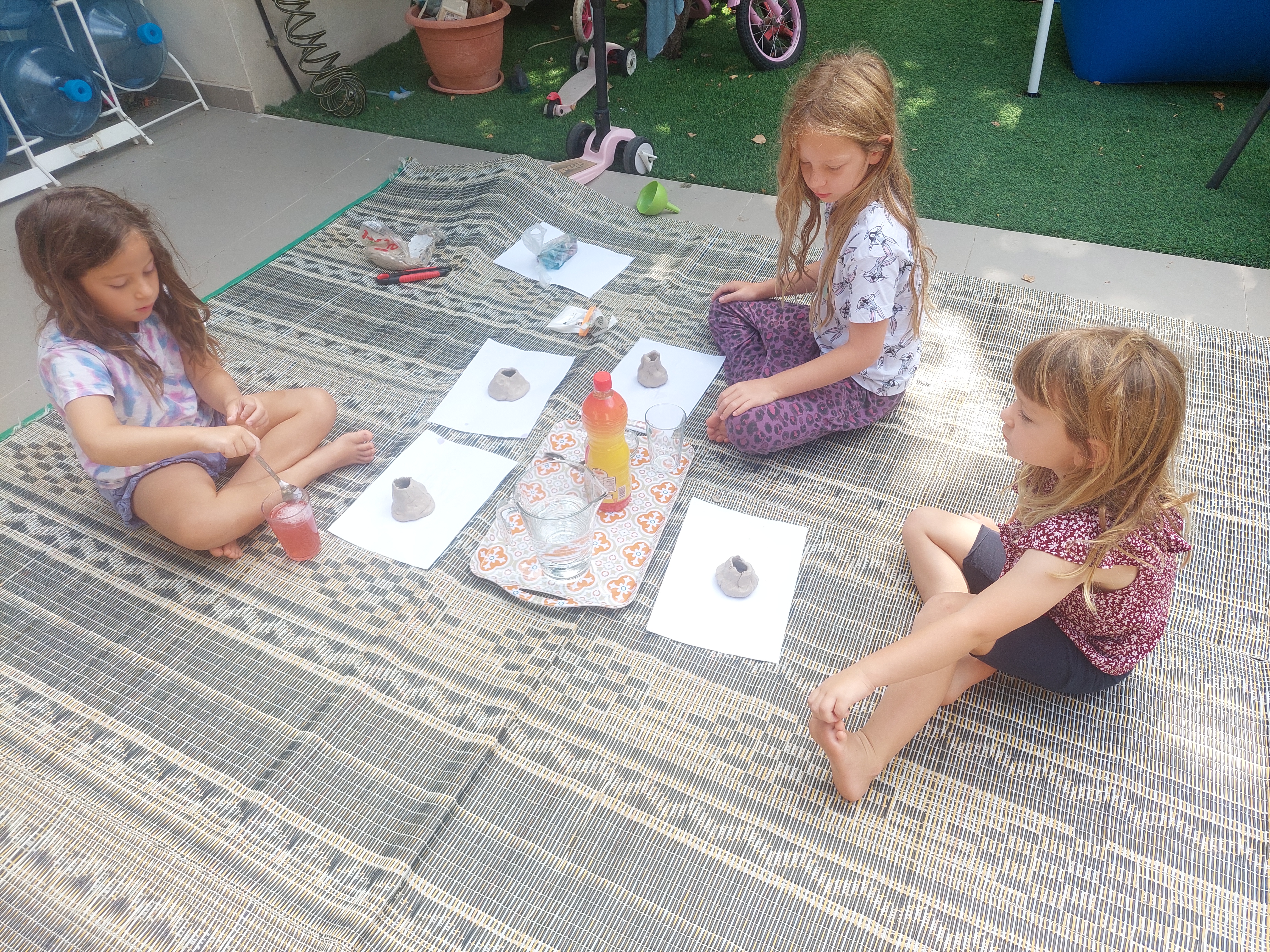 כיוון שהתעייפנו ויחד עם הסירות הילדות גם רצו להיכנס לבריכה, סיימנו את יום איטליה, אבל הייתה עוד פעילות שלא הספקנו שהיא הר געש מחימר (כי באיטליה יש הרי געש, גם פעילים), חומץ וסודה לשתייה. הבטחתי להן שנתחיל עם זה על הבוקר לפני המדינה הבאה, וכך היה. כל אחת הכינה הר געש קטן מחימר, לתוכו שפכנו מים שערבבנו בכוס עם צבע מאכל אדום כפית אבקת סודה לשתייה וקצת סבון וכל אחת שפכה לבפנים קצת חומץ שבחיבור עם הסודה הפך לתוסס ונשפך החוצה כמו לבה.