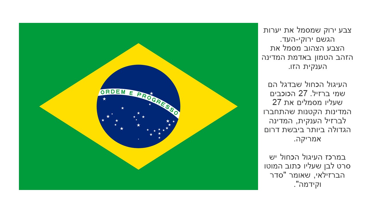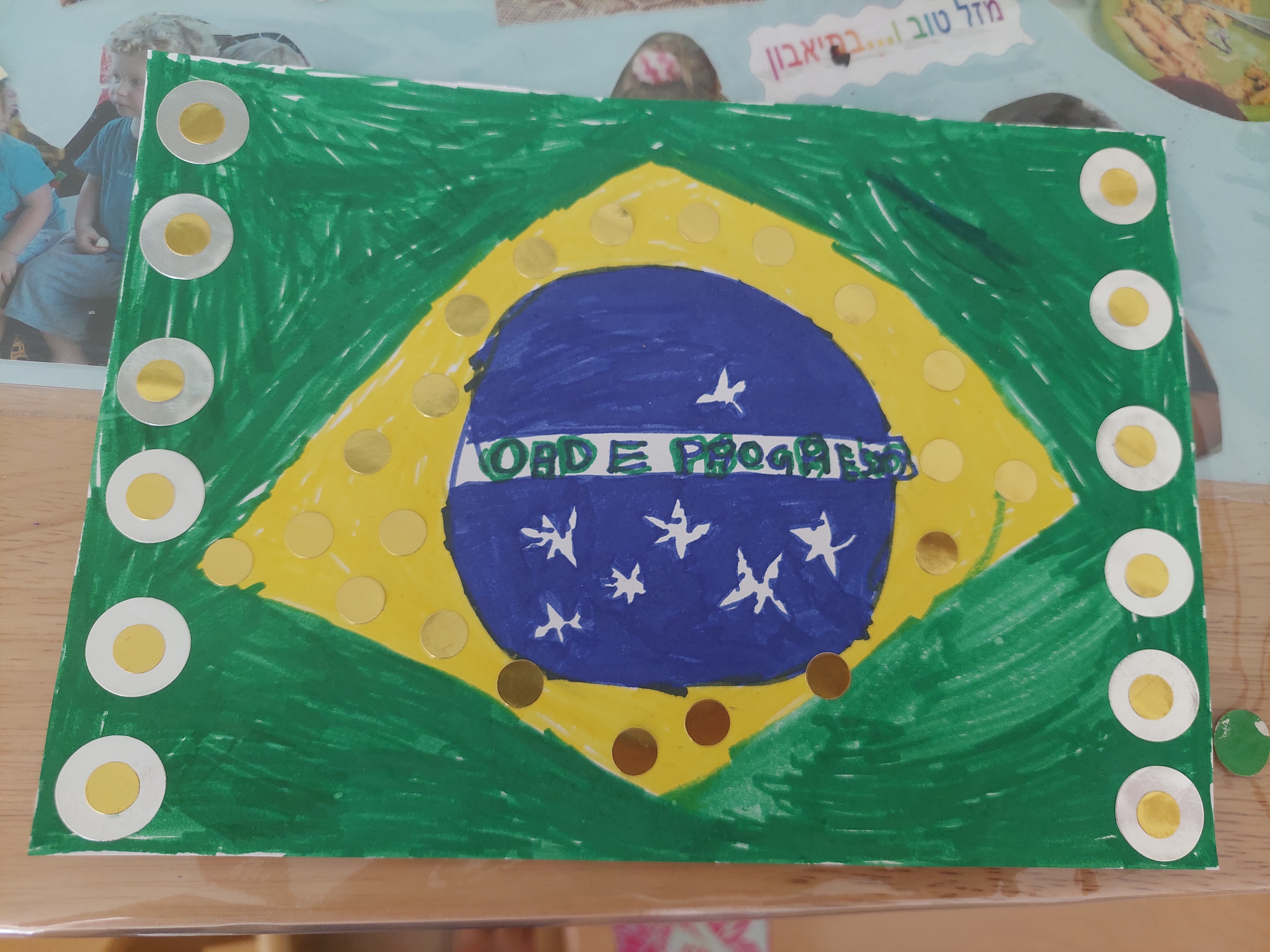 אז אחרי שעשינו הרי געש מאיטליה, החתמנו דרכון, המראנו, מצאנו את הדגל, שמתי להן שקופית גדולה של הסמל בטלוויזיה כדי שיראו טוב את כל הפרטים, הסברתי על כל פרט בדגל מה הוא מסמל, זה ריתק אותן, יצרנו את הדגל על בריסטול עם טושים ומדבקות, מצאנו את ברזיל במפה ובגלובוס, למדנו מילים בפורטוגזית.