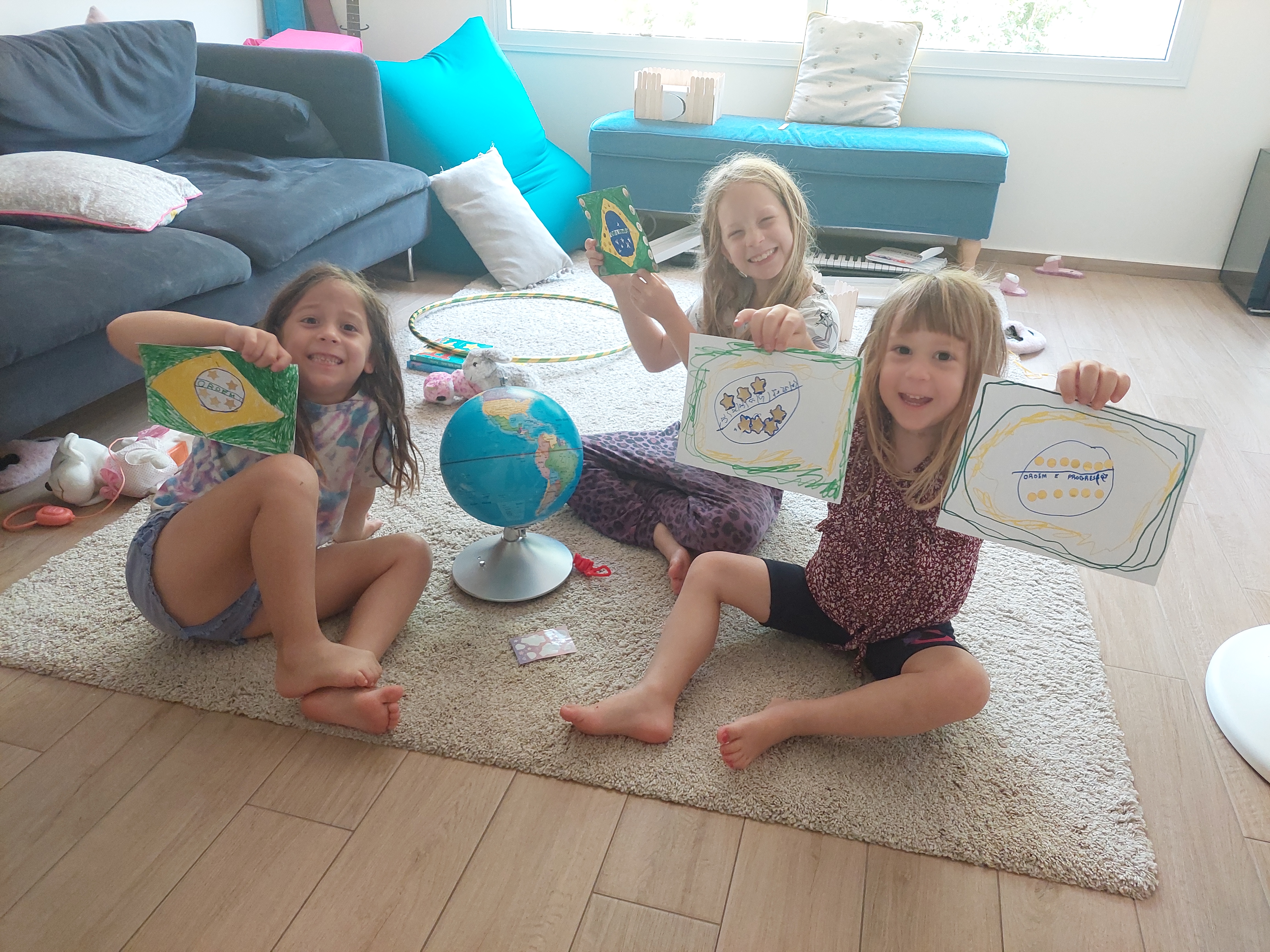 הארצות שנבחרו הן: איטליה, ברזיל, טנזניה ויפן. אמא שלי עשתה להן קייטנת סבתא בצרפת (יום בשבוע הן איתה).