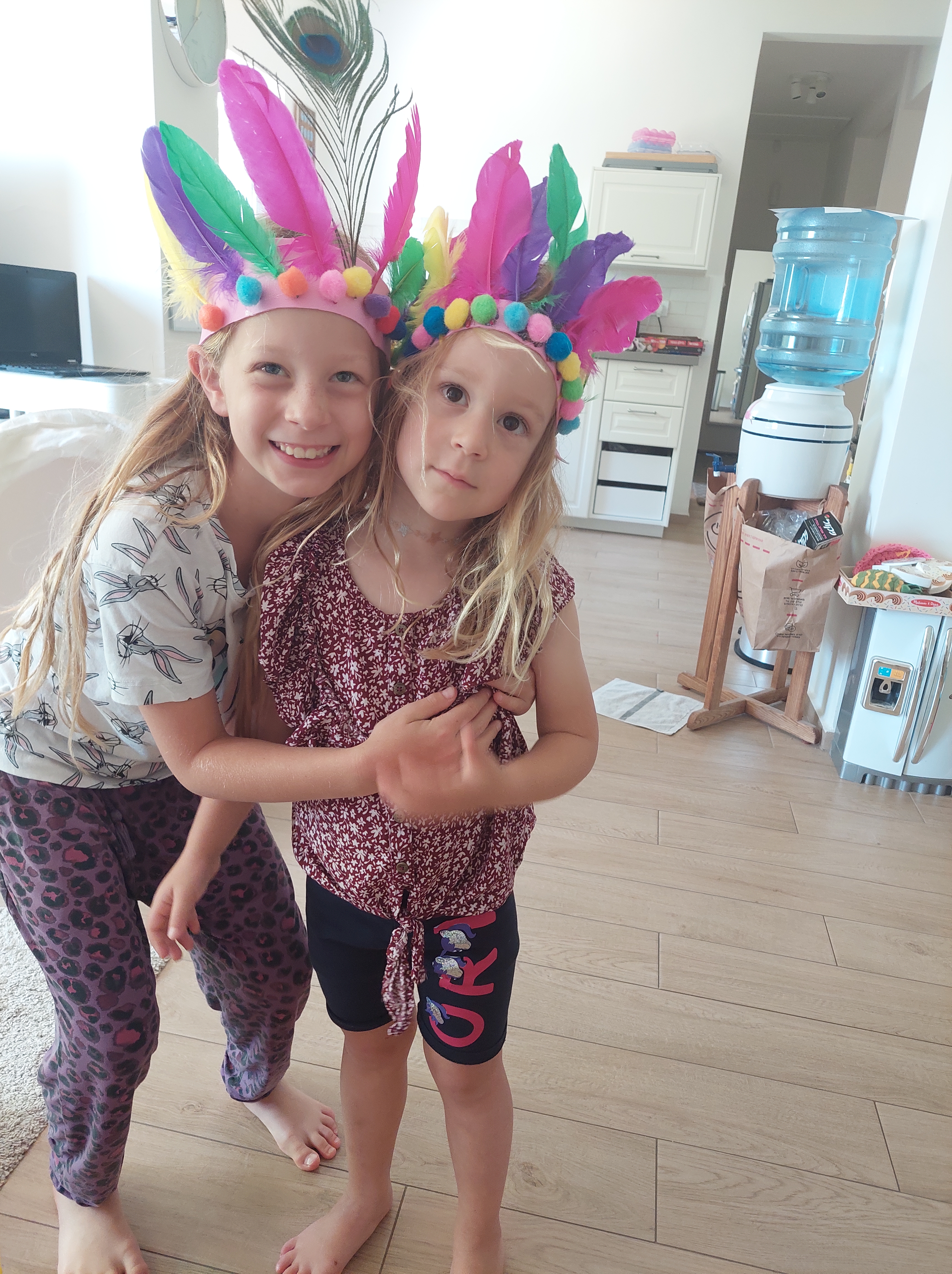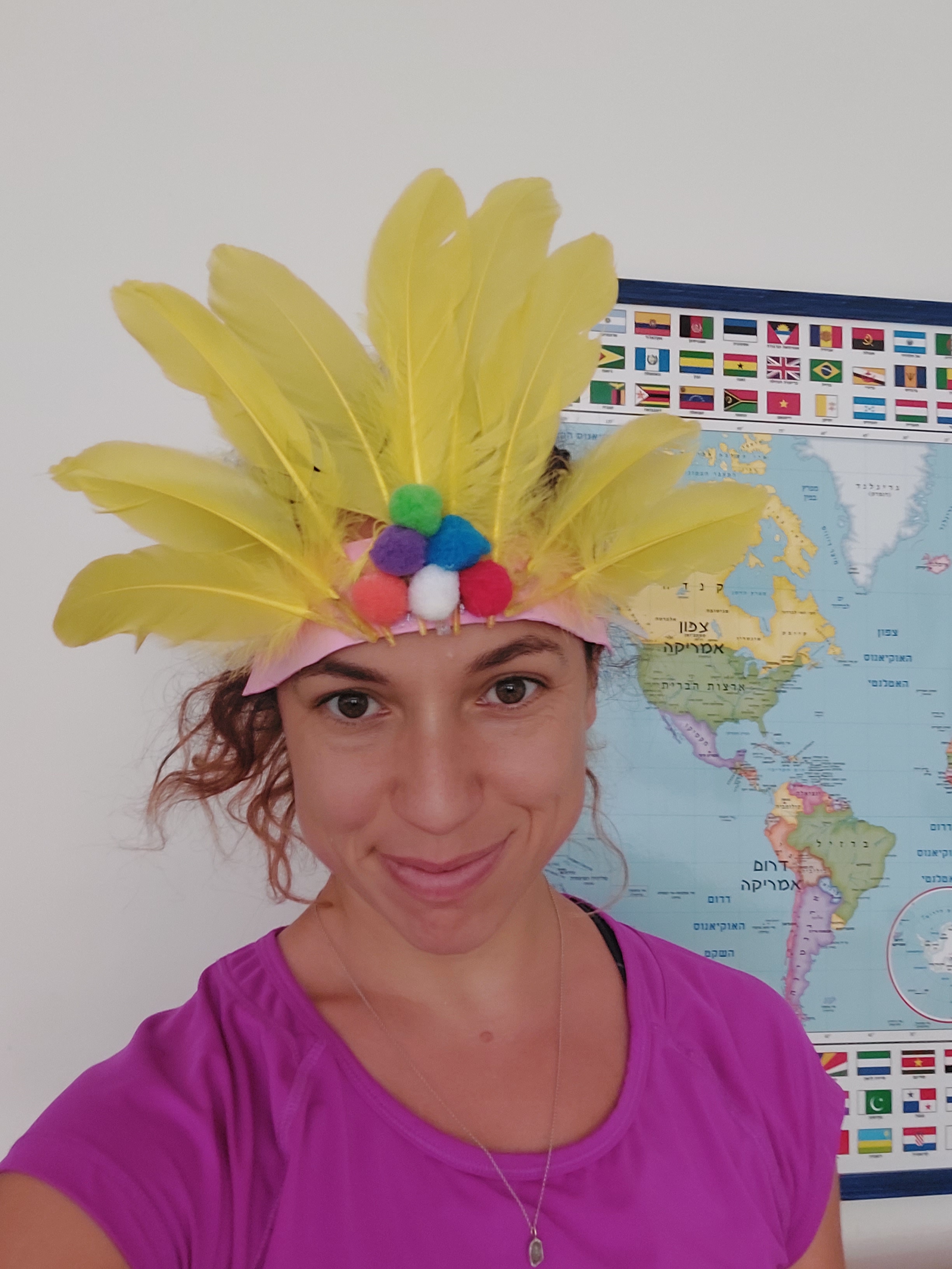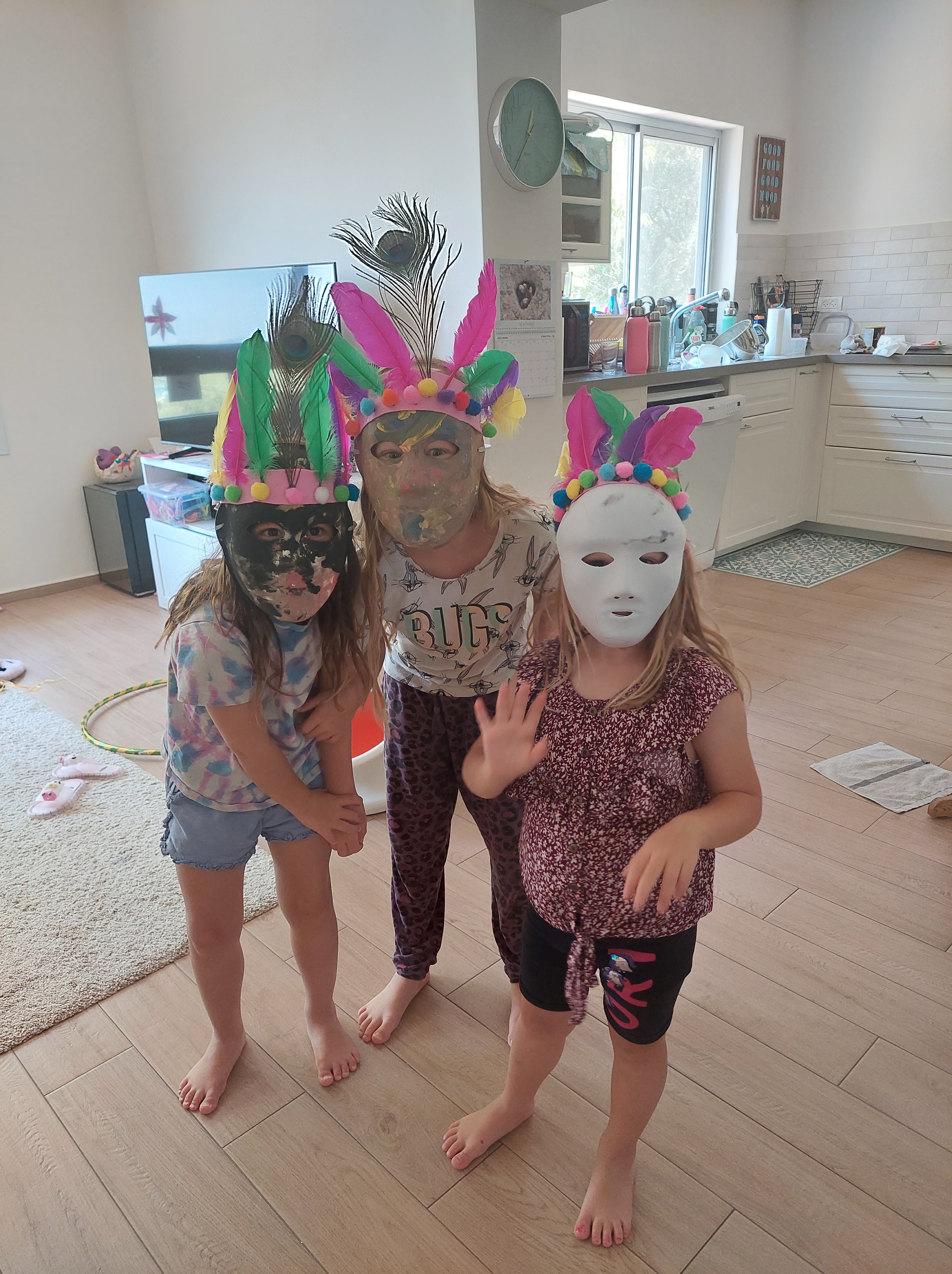 ראינו סרטון (בחרתי מראש) של הקרנבל המרשים בברזיל, הכנו כתרים לקרנבל משלנו עם נוצות, פונפונים, סול וגומי. את הקישוטים הדבקנו עם דבק חם. הילדות גם הוסיפו מסיכות מהתחפושות שלנו ויחד עם הכתרים נהנו ממשחקי תפקידים.