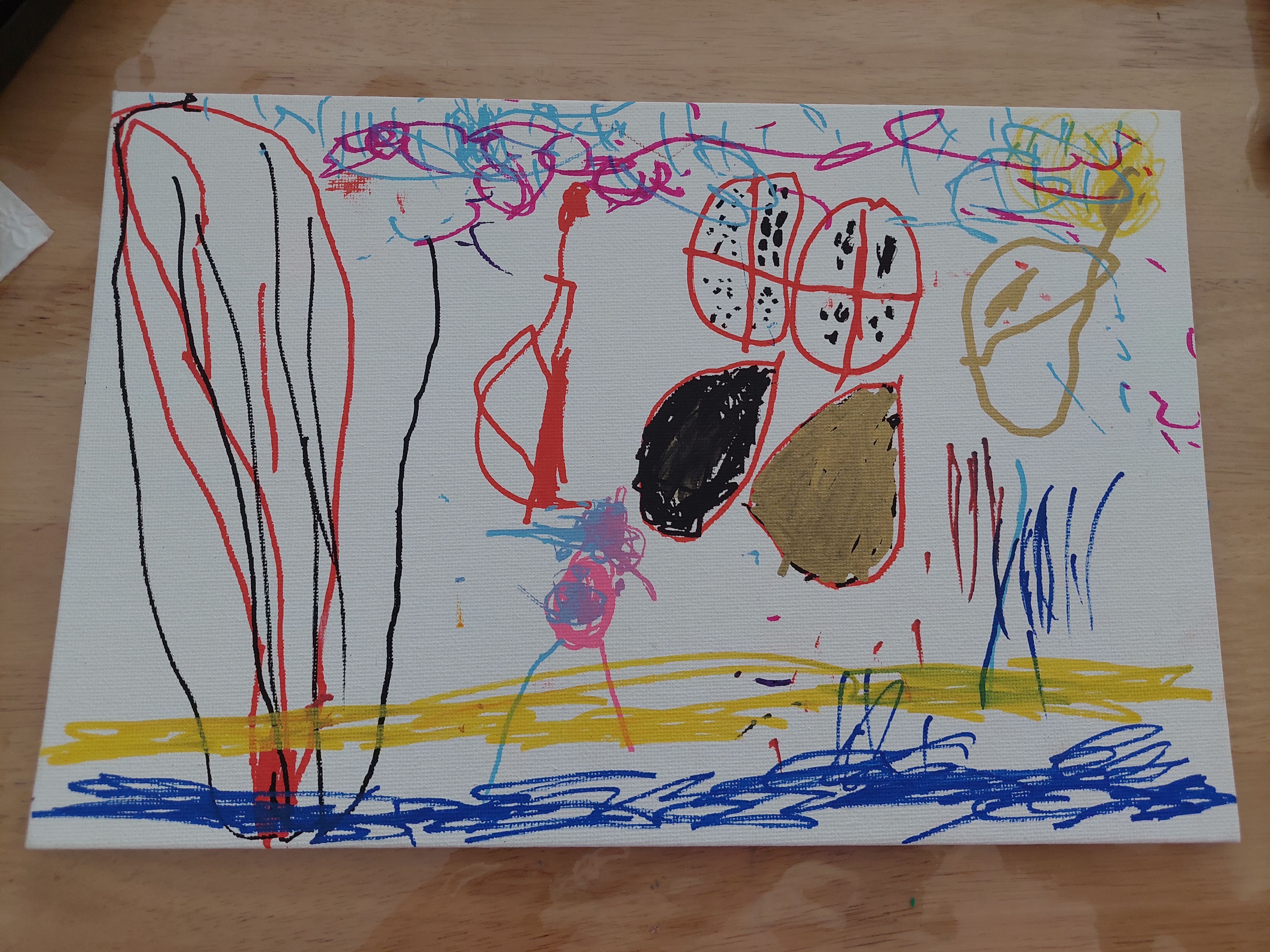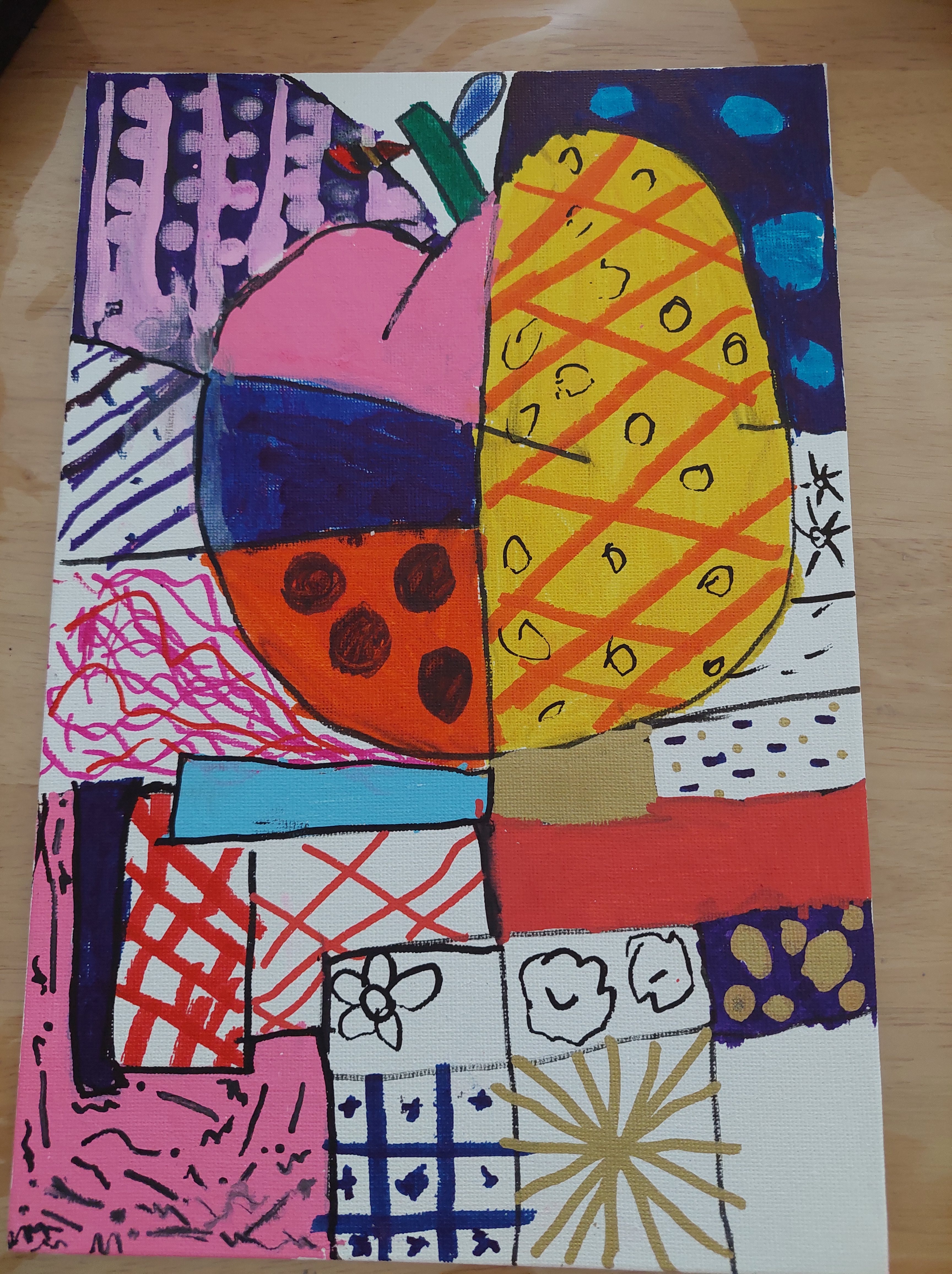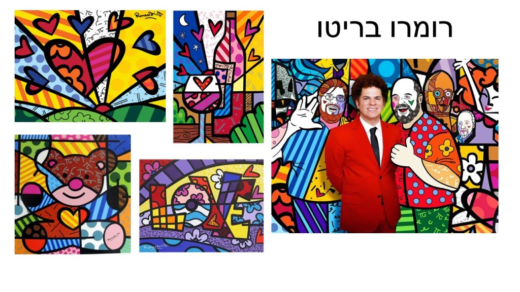 אחרי זה למדנו על אמן ברזילאי מפורסם בשם רומרו בריטו שיש לו אומנות ממש מגניבה וצבעונית. הכנתי להן מראש מצגת עם יצירות שלו להשראה, חילקתי להן קנבסים בגודל A4, וציירנו בטושי אקריליק וארטליין ציורים בהשראת היצירות של רומרו בריטו.