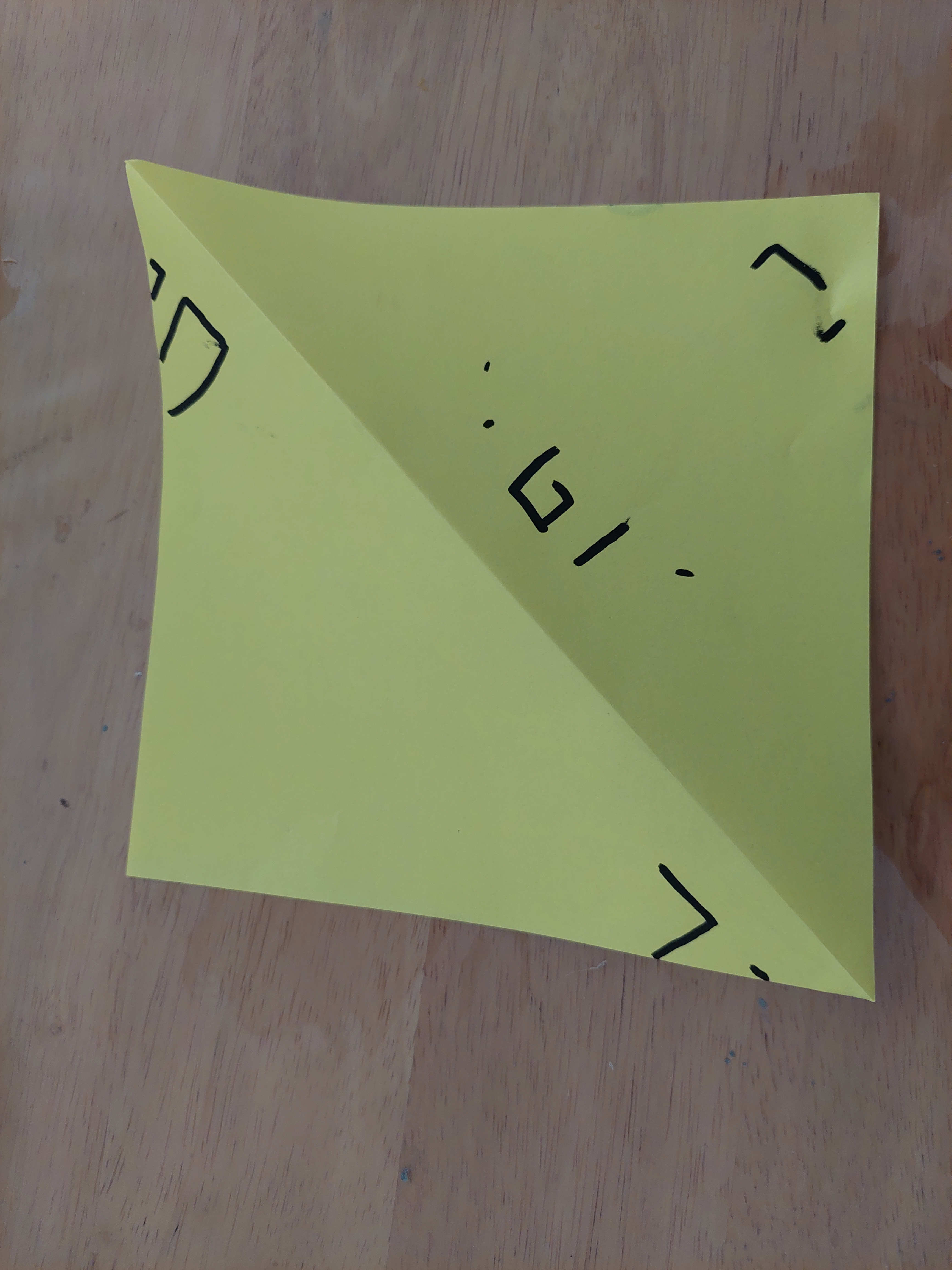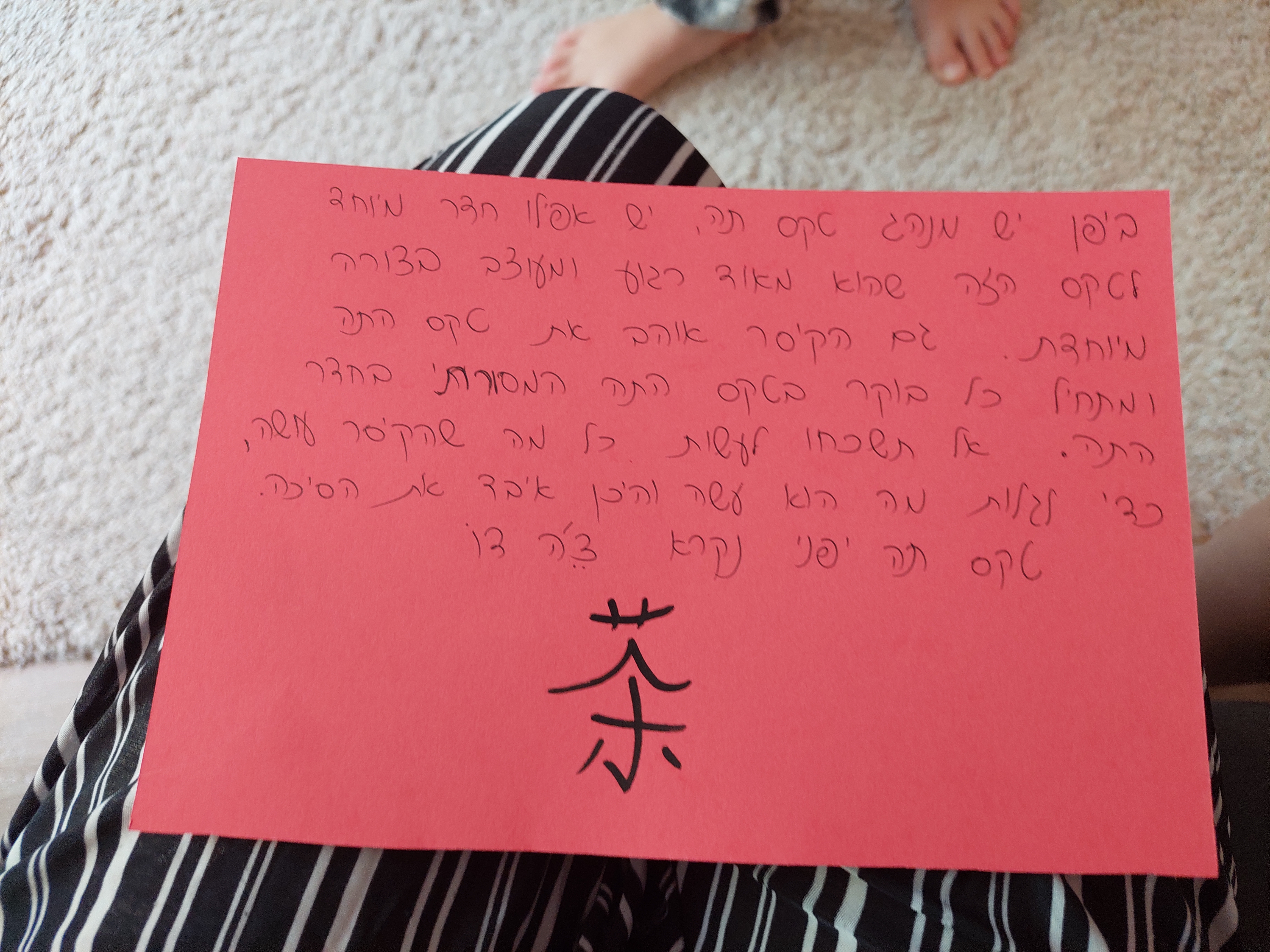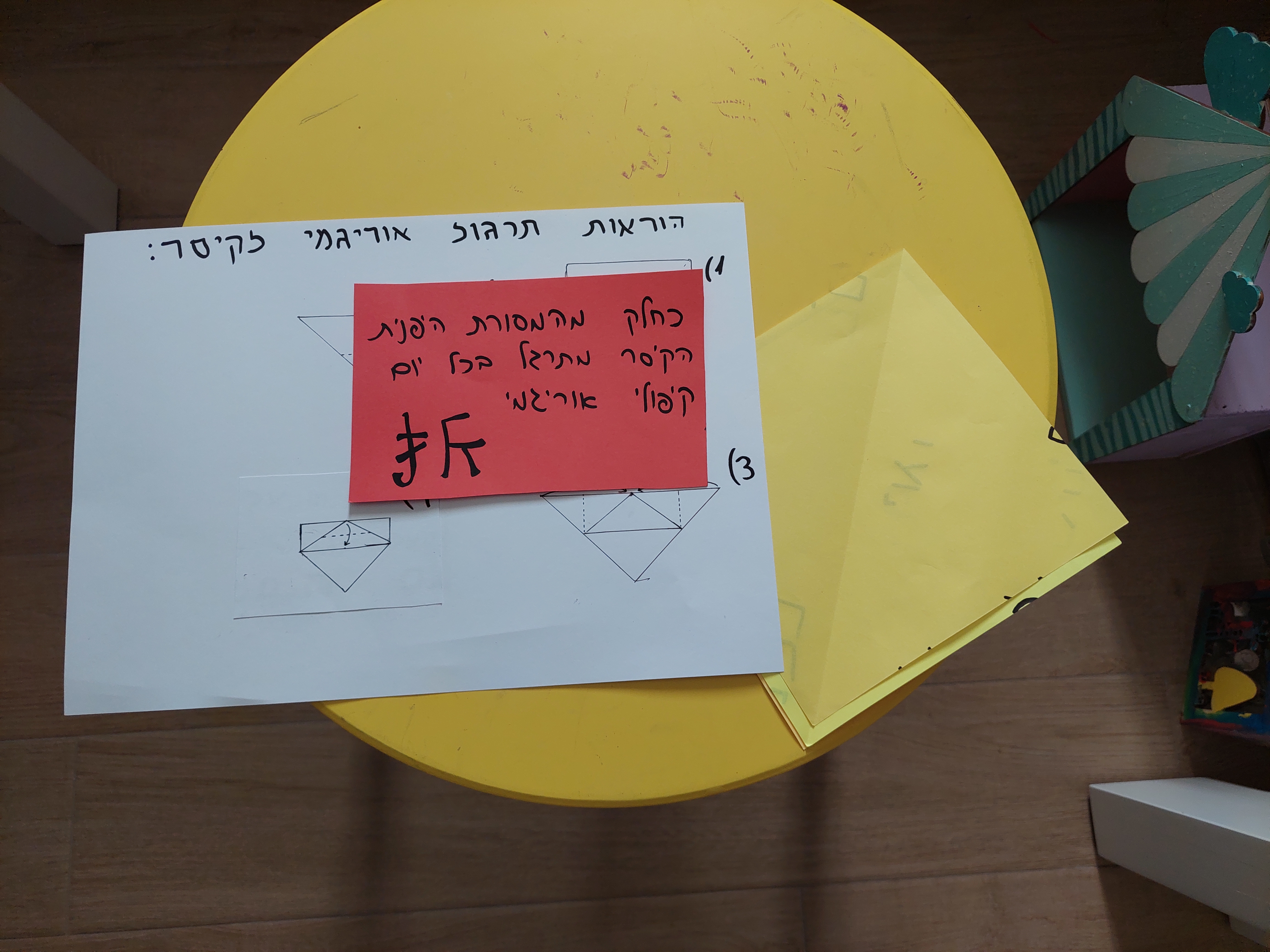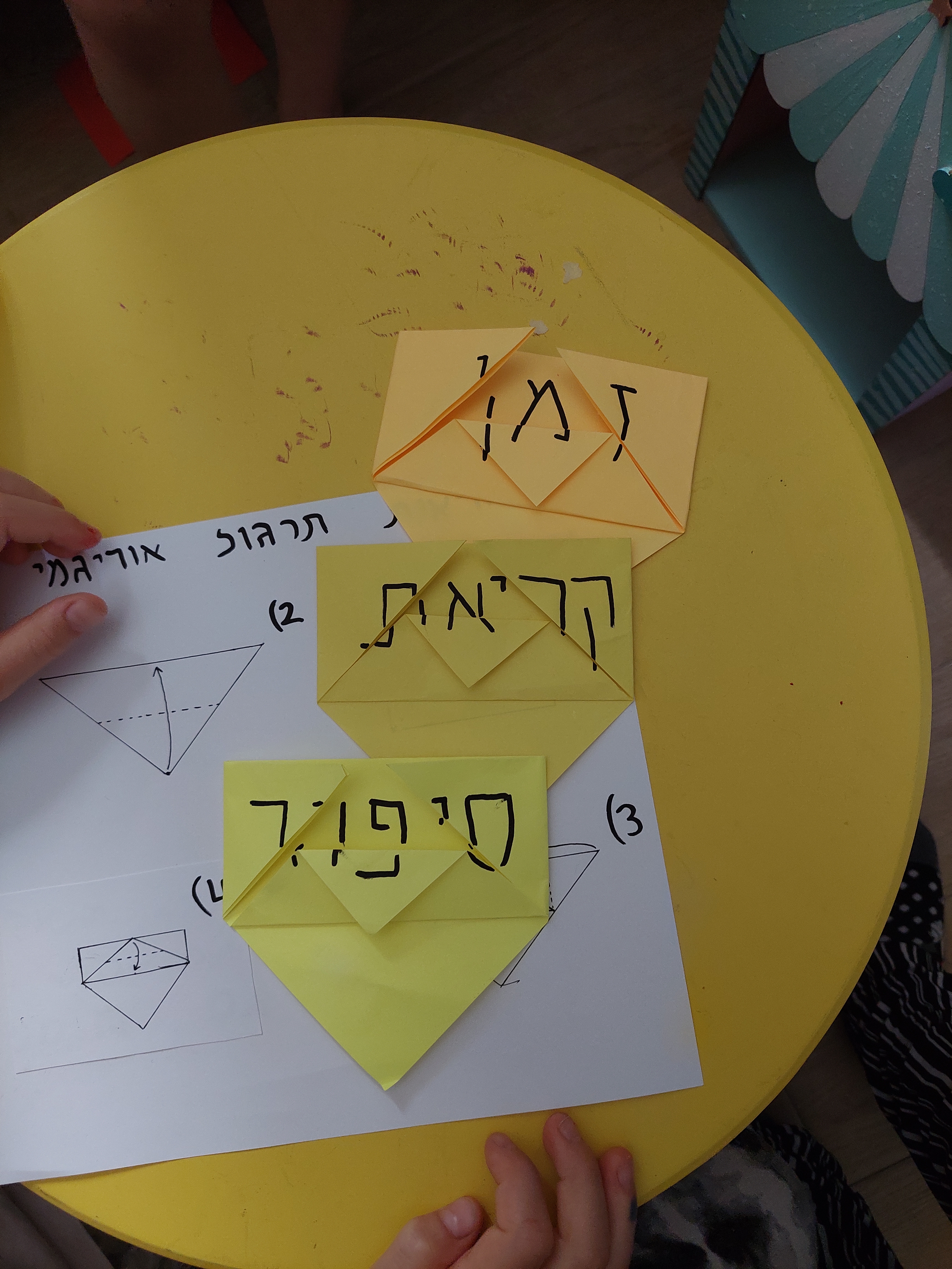כאשר הגיעו לחדר שלהן חיכה להן שם שולחן עם פתק שרשום עליו שכחלק מהמסורת היפנית הקיסר מתרגל בכל יום אוריגמי. היו להם 3 דפים עם סימונים עליהם וליד הסבר קיפול אוריגמי, כאשר קיפלו את האוריגמי לפי ההסבר קיבלו בכל דף מילה (קיפלתי מראש קיפול אחד אלכסוני כדי שידעו את הכיוון שצריך לקפל), כשחיברו את המילים קיבלו את המקום הבא "זמן קריאת סיפור".