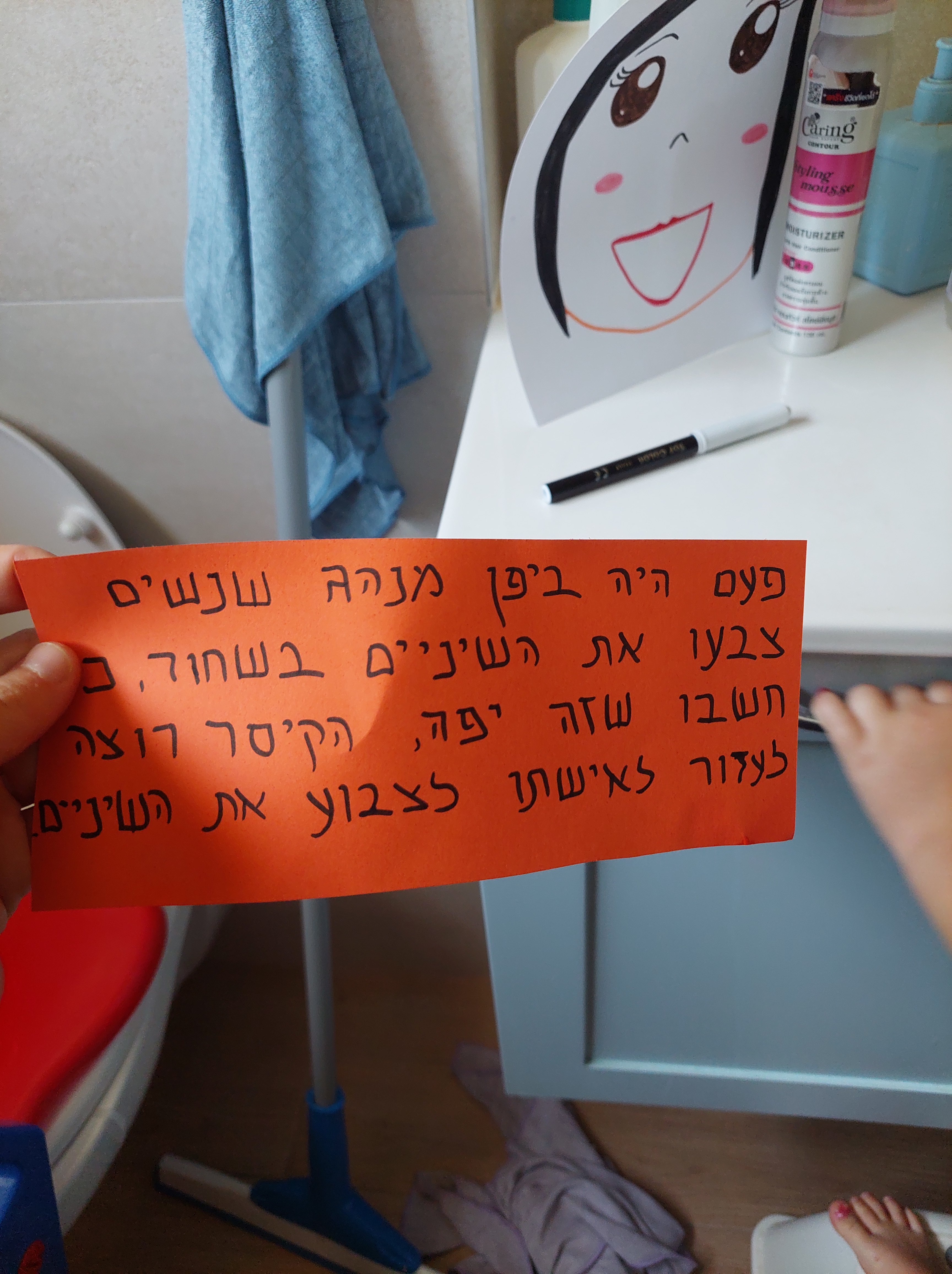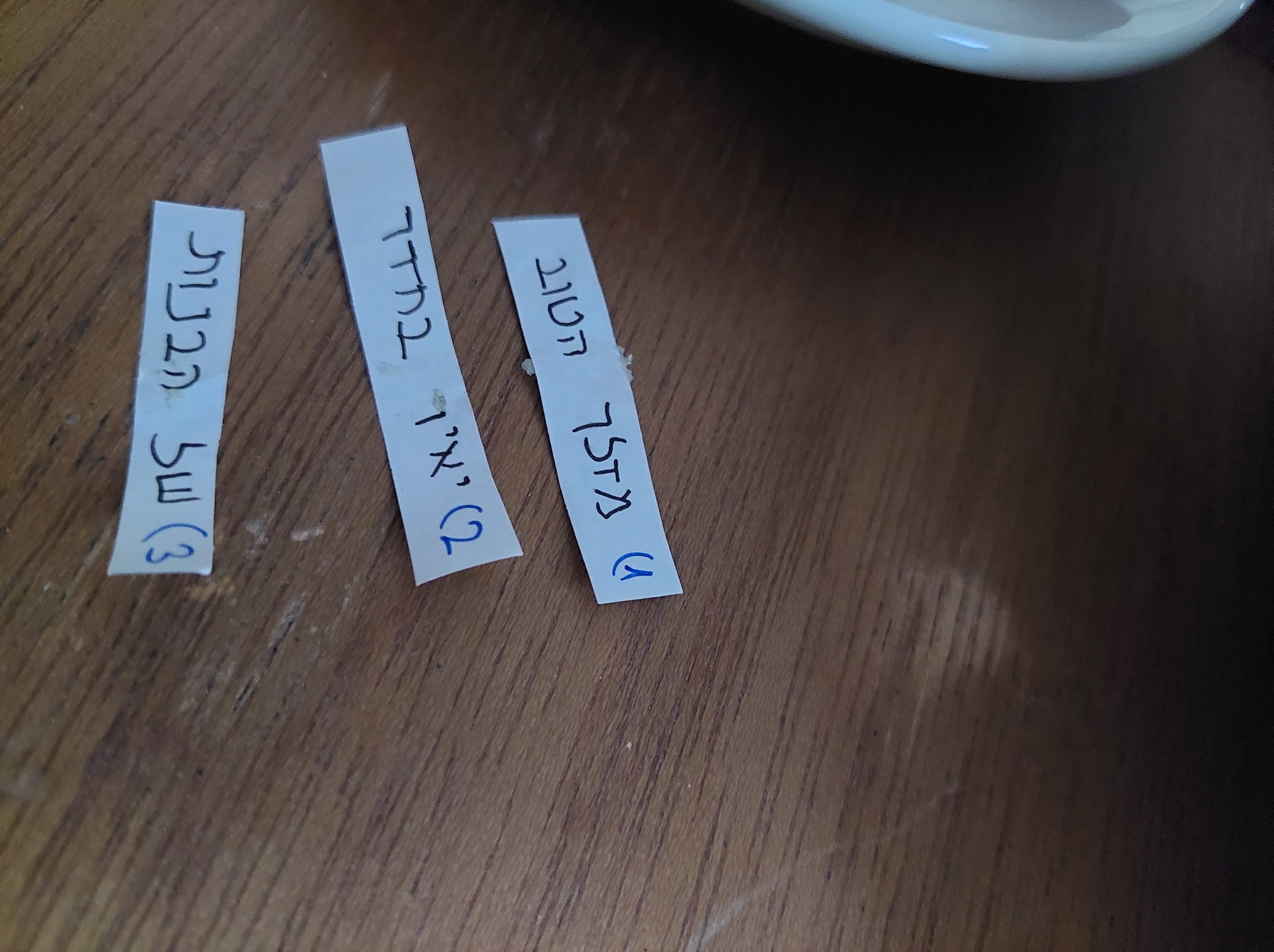 כששברו את עוגיות המזל שהכנתי עבורן עם פתקים בפנים, היו בפנים כל מיני ברכות כמו "יום מנצנץ" "הגשמת חלומות" וכו'… ו3 פתקים היו עם מספר לידם וכאשר סידרו את הפתקים לפי המספרים הרשומים, היה כתוב "מזלך הטוב יאיר בחדר של הבנות".