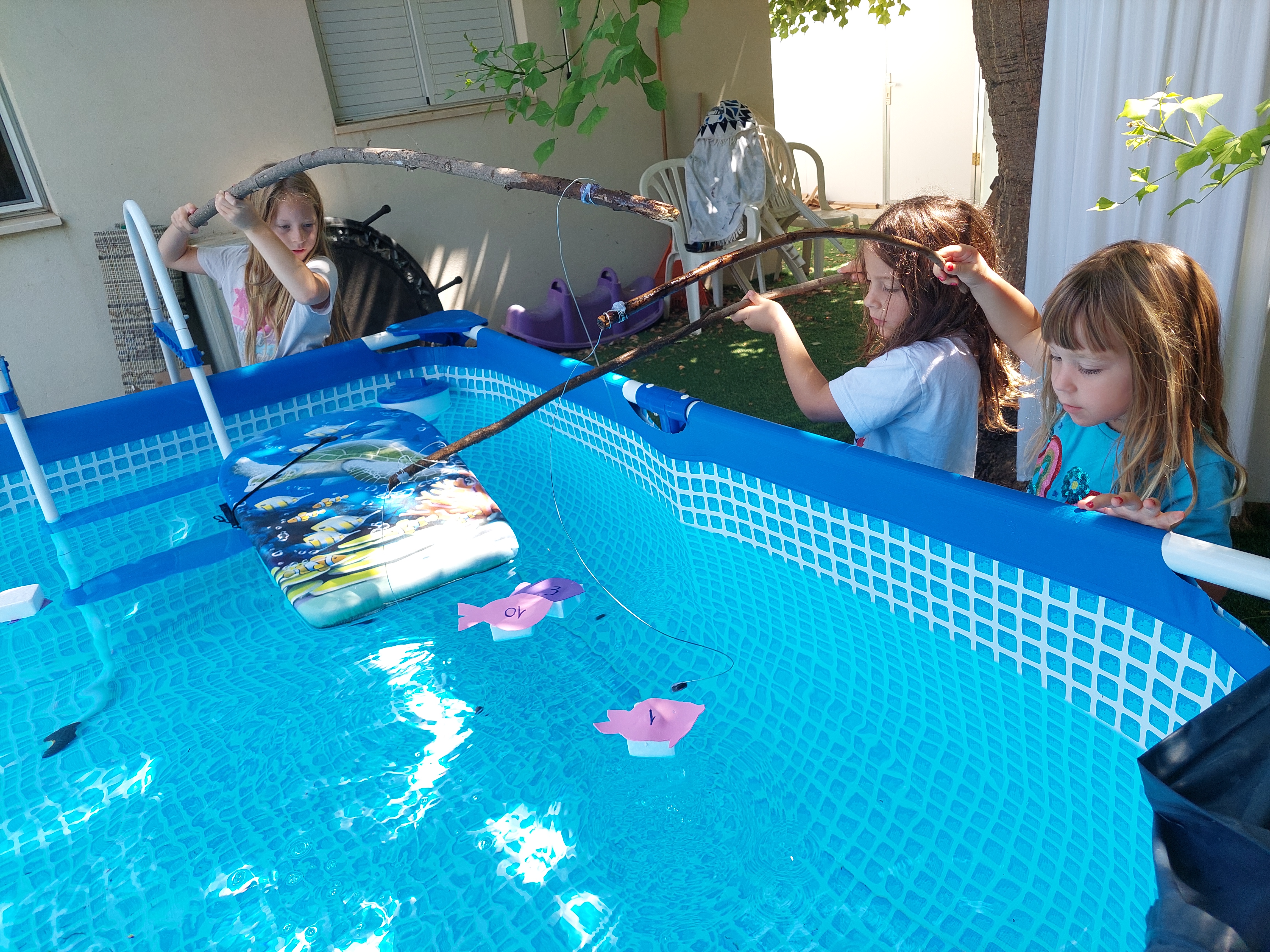 הן יצאו לבריכה בחצר, שם חיכה להן פתק שכתוב בו שביפן אוכלים המון דגים, הן היו צריכות לדוג את הדגים שהכנתי מקלקר, סול ומגנטים. את החקות הכנתי מענפי עץ, חוט מתכת ומגנט (הדבקתי בדבק חם). על הדגים היה מלמעלה מספרים, כשסידרו את הדגים בסדר המספרים והפכו אותם היה כתוב למטה משפט "הכנת ארוחת צהריים".