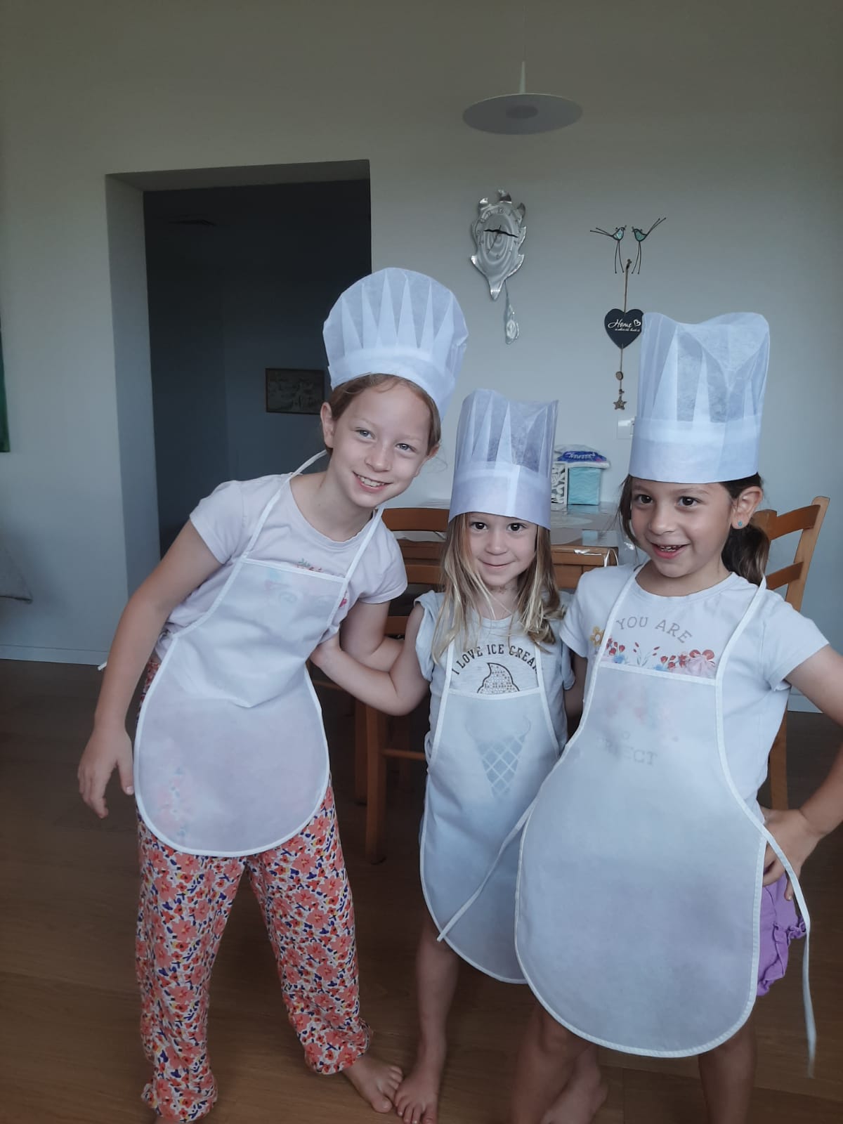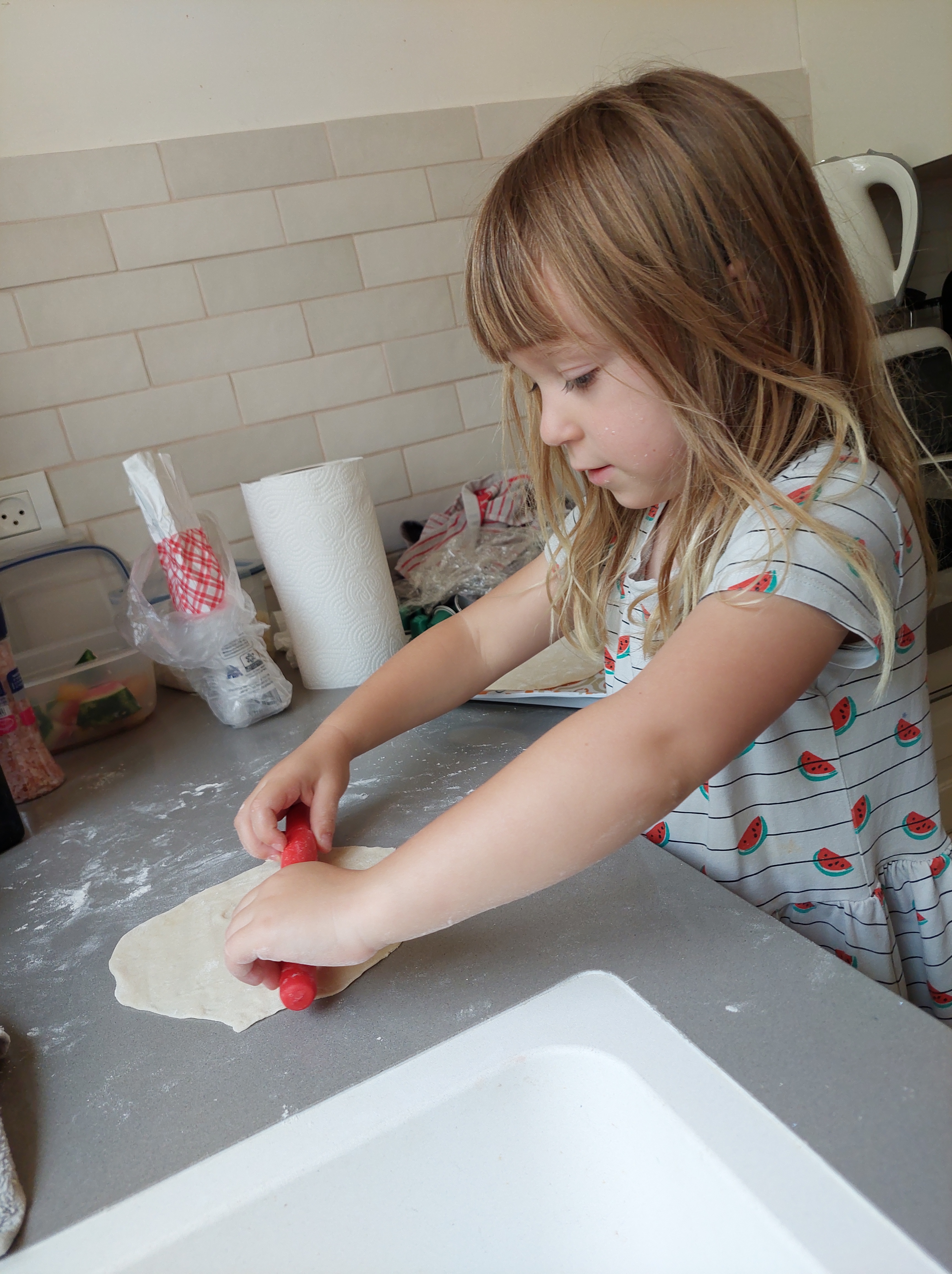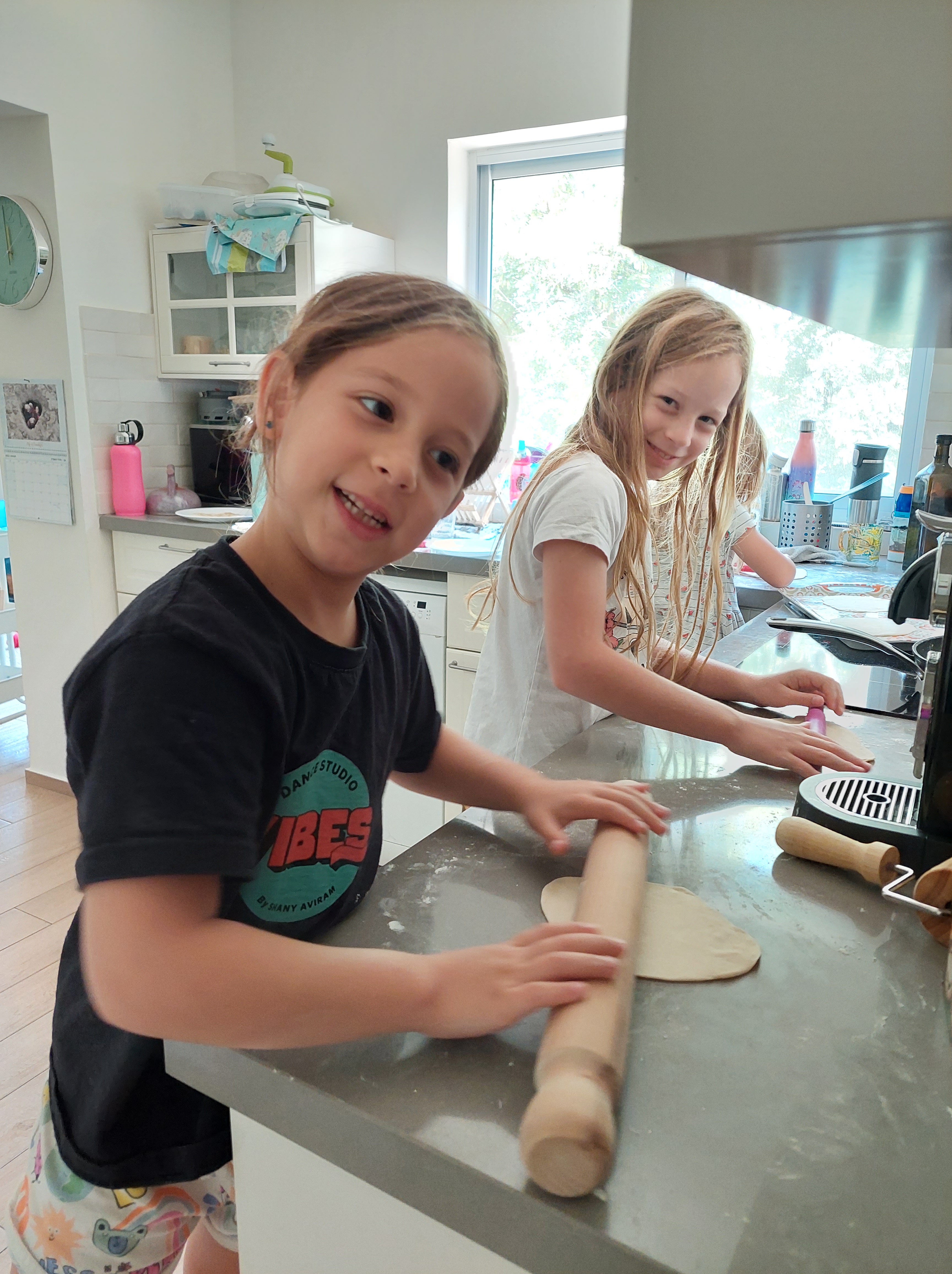 הכנו יחד בצק לפיצה, בזמן שתפח הכנו פנקוטה לקינוח, וברוסקטה עם עגבניות, ובזיליקום לארוחת בוקר (וגם קצת כאלה עם חמאה לבררניות).