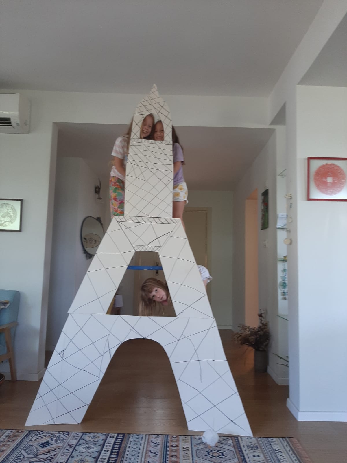 בבית הן ראו סרטון על מגדל אייפל ואז הן הכינו את מגדל אייפל מקאפות שאמא שלי חתכה מראש לפי צורת הסולם, הן ציירו וחיברו לסולם, ואז הן טיפסו על הסולם והצטלמו במגדל האייפל שלהן.