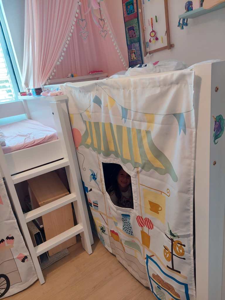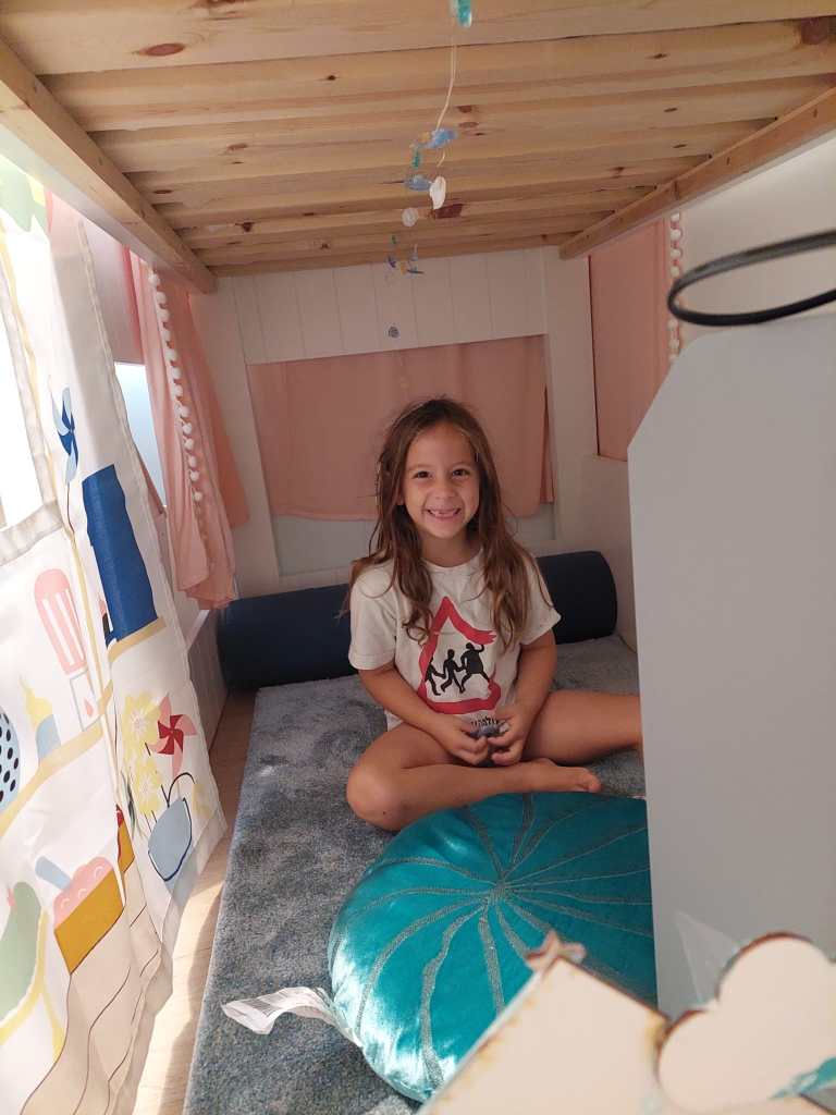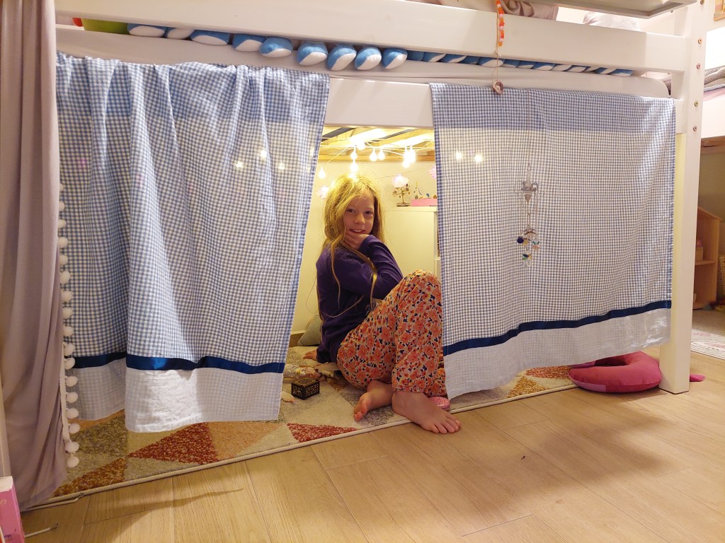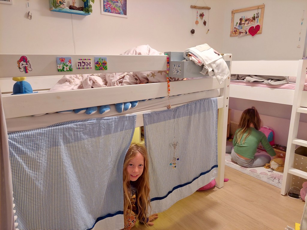 במיטות הגבוהות מאוד נעים, מרחב מחובר שהוא מעל הכל, שם הכל רגוע ונעים, וליד כל מיטה תלויים קישוטים אישיים של כל ילדה. בחדר יש גם שידת ספרים גבוהה.
