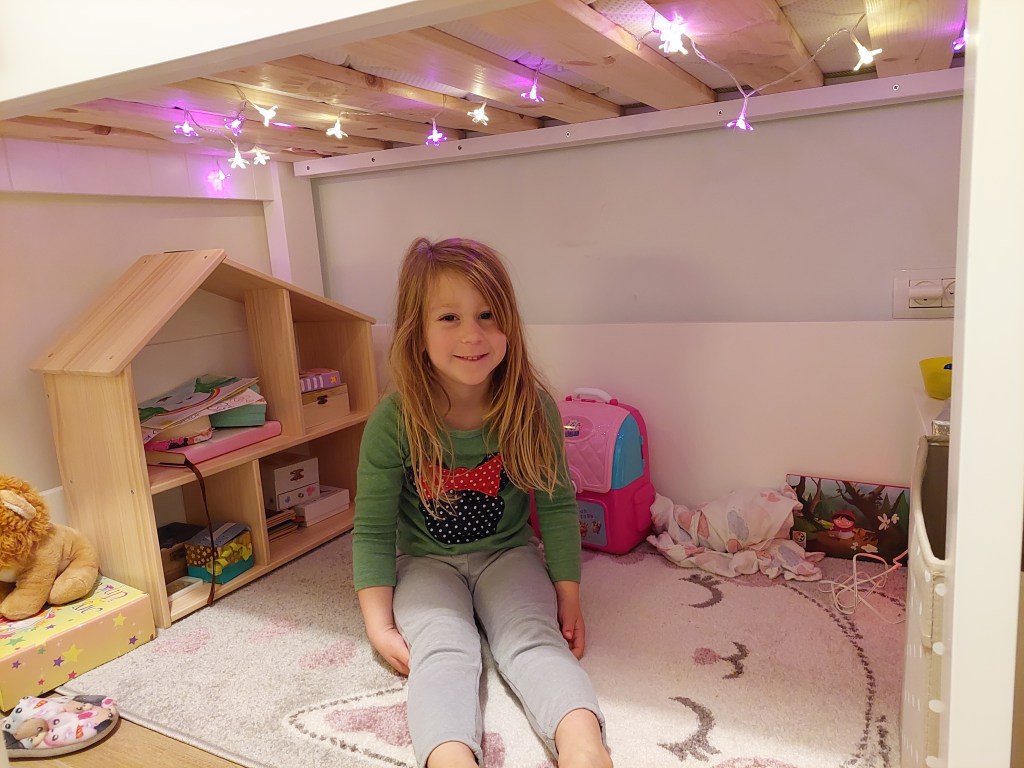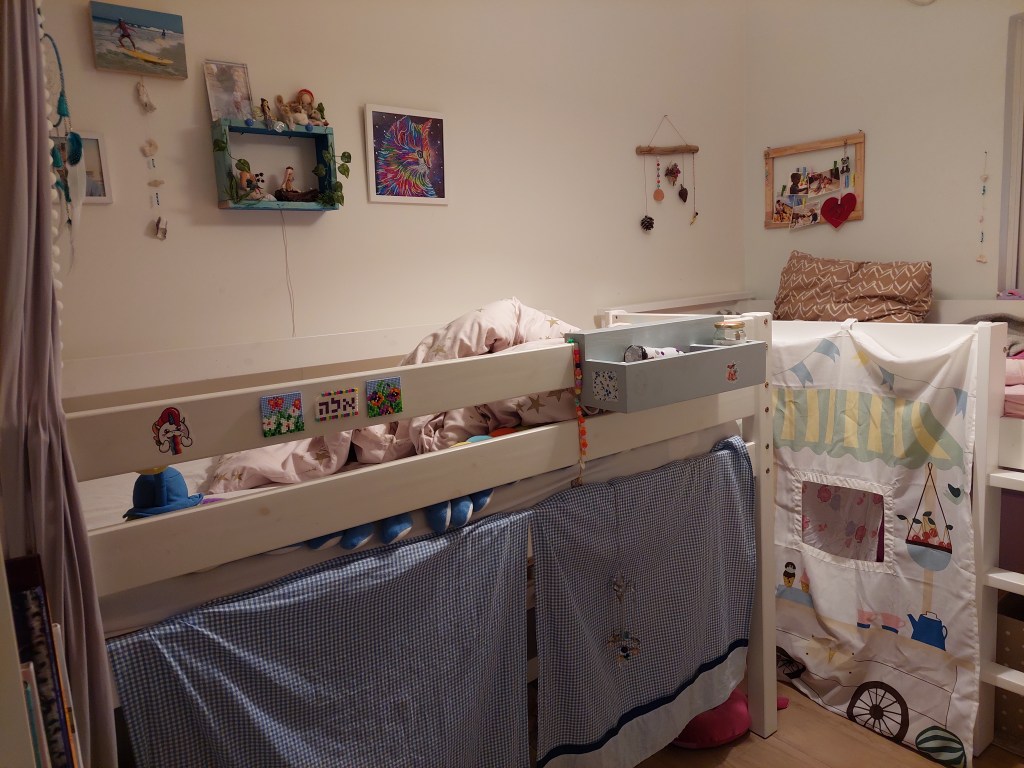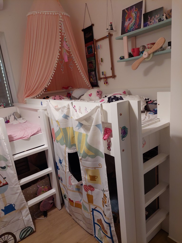אז מה הפתרון? מיטות גלריה, מיטות הגלריה בגובה של כ80 ס"מ, מתחת לכל מיטה יש מרחב פרטי לכל ילדה, כל אחת בחרה לה שטיח שהיא רצתה, שידה לשים בה את ה"אוצרות" והדברים האישיים שלה, כרית, מנורות קטנות ווילונות. כל אחת סידרה לעצמה מרחב מקסים פרטי ונעים, שם היא גם שמה דברים שהיא לא רוצה שיגעו כמו תיבות אוצר, פיות וכו', מתבודדת שם כשזקוקה לזמן שקט וגם מזמינה את האחיות להתארח במרחב שלה.