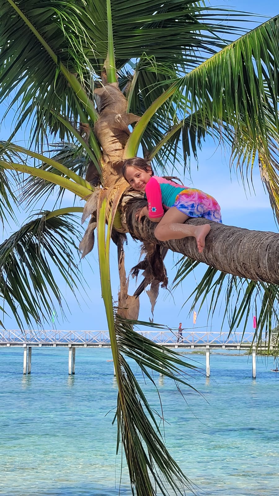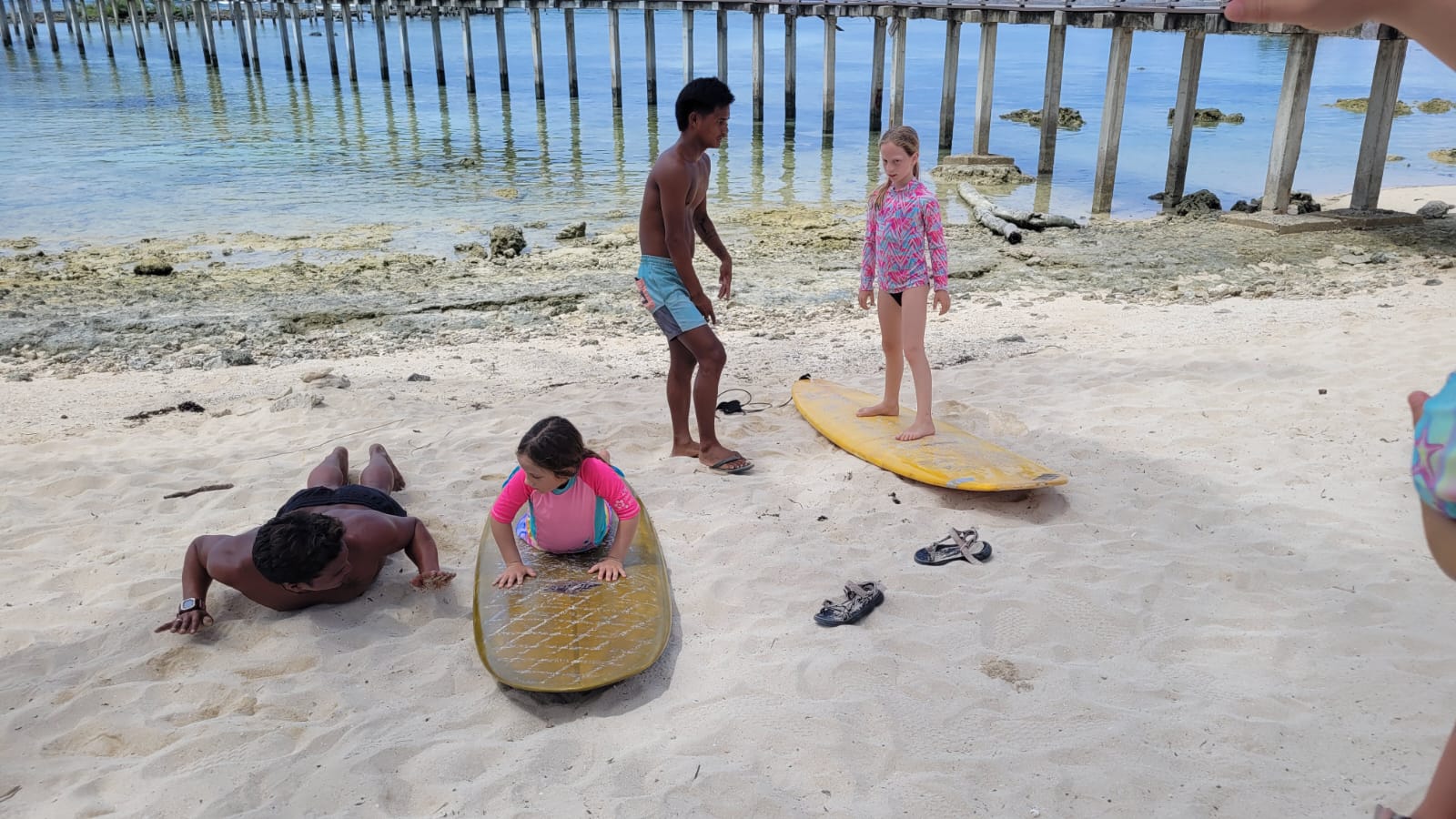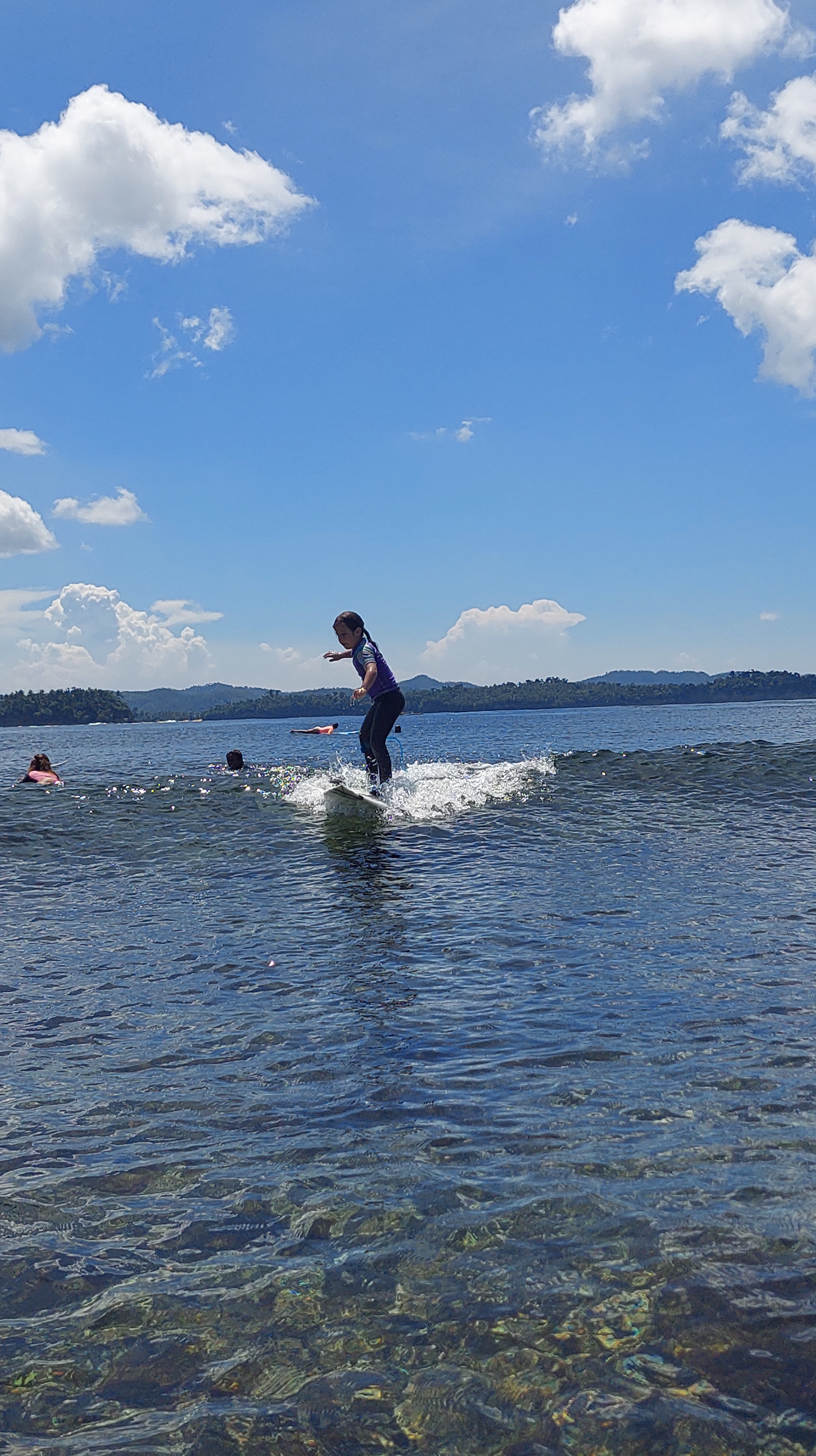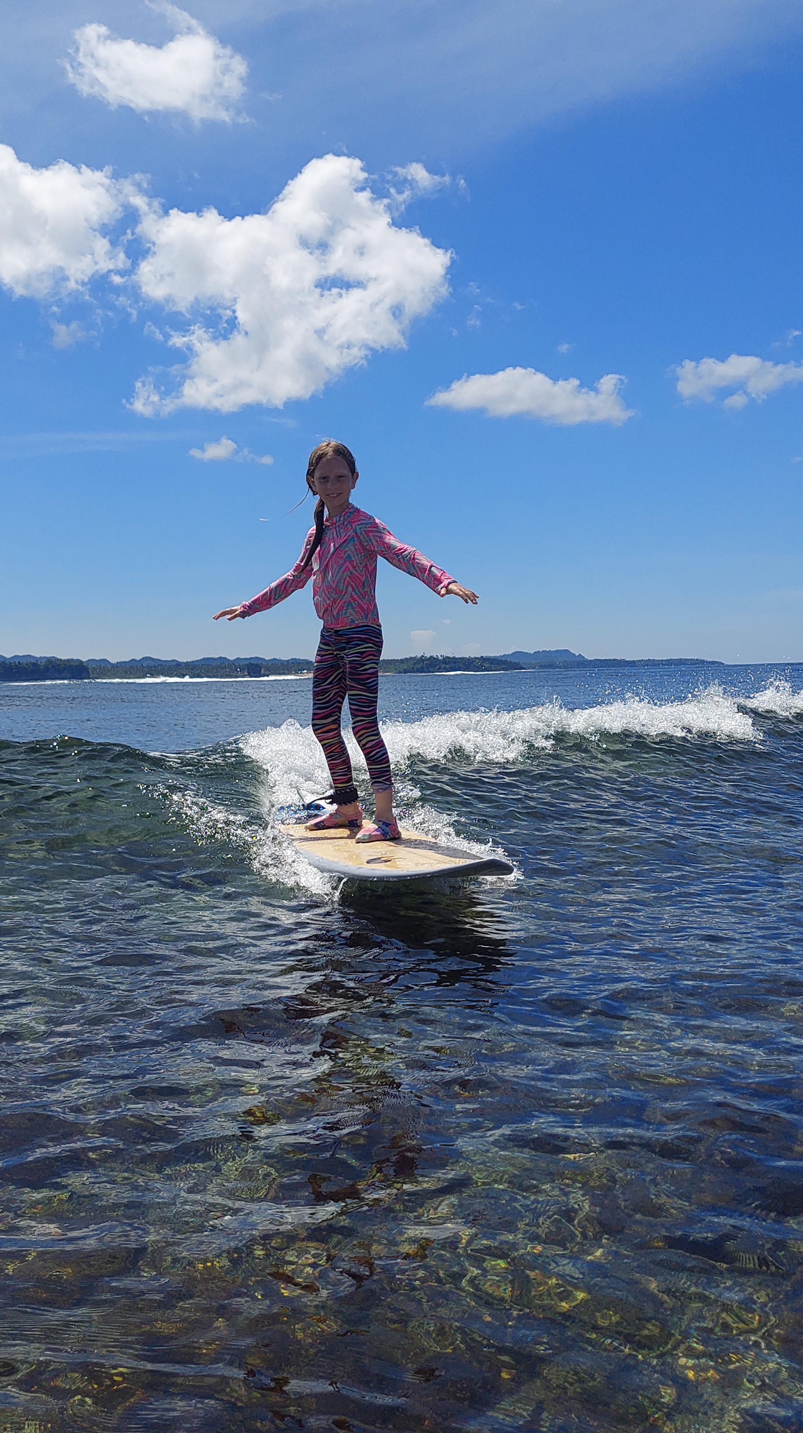 אחרי כמה ימי גלישה חיפשתי מדריך קבוע מומלץ לילדות והמליצו לי על מישהו שמלמד בחוף אחר, רחוק מהמרכז. הוא אמר שהוא לא מלמד בקלאוד 9 העמוס כי זה מסוכן והוא גם מלמד כל פעם לפחות שעתיים ברצף. הגענו אליו, התאהבנו. הוא וכל המשפחה שלו (אחים ובני דודים) מלמדים גלישה, הוא מתוק וקשוב בצורה בלתי רגילה, הוא גם יודע קצת עברית, מה שמאוד נוח לילדות, מאוד אחראי והחוף שהוא לקח אותנו פשוט קסום. בעצם מגיעים לבית של הורים שלו והוא מסיע אותנו עם אופנועים לחוף אחר, בשפל הולכים על סלעים ואלמוגים ורואים מלא כוכבי ים בצבע כחול רויאל, אלמוגים מהממים עם דגים בתוכם, ועוד קסמים… והגלישה איתם הייתה מדהימה.