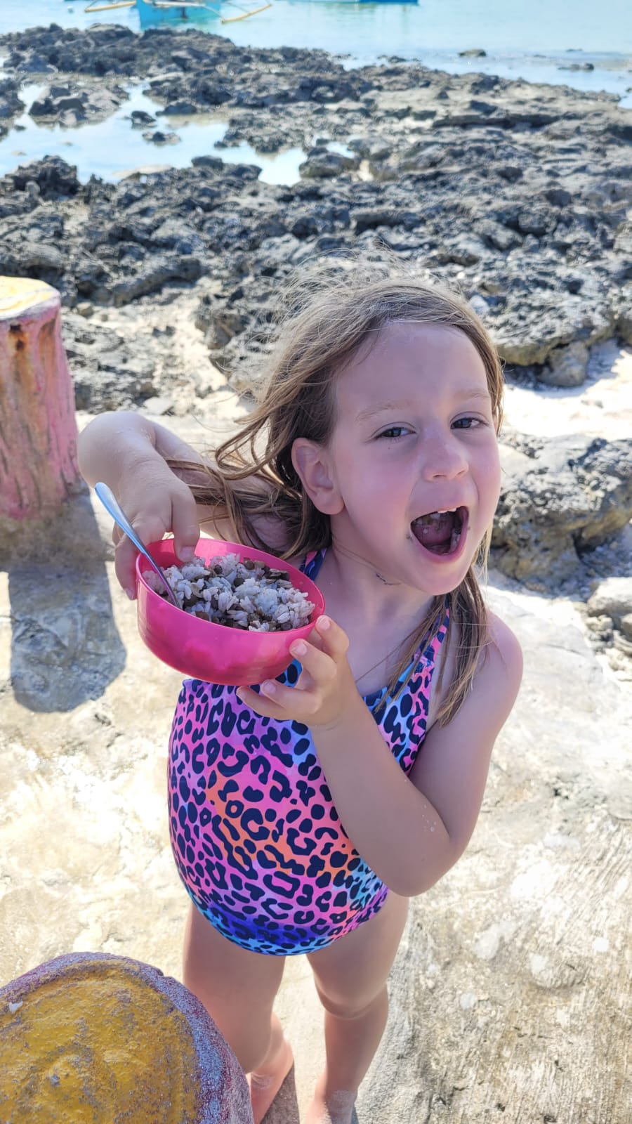 פה החלטנו שאנחנו לא נופלים למלכודת תיירים עם סיור מאורגן שכולל אוכל ושתייה שגם ככה הילדות לא אוכלות ואנחנו לא שותים, אז הלכנו לנמל, ביקשנו רק סירה עם נהג, הבאנו לעצמנו אוכל (אחד הדברים שאני סוחבת איתי בטיול זה כירה וסיר שמאפשרים לי לבשל עדשים), הזמנו מהמלון גם ביצים קשות ואורז שיהיה עם העדשים, קנינו קצת פירות. היה טיול מאוד נחמד בין איים. אורי ממש רצתה לגלוש והבטחתי לה שנגלוש למחרת.