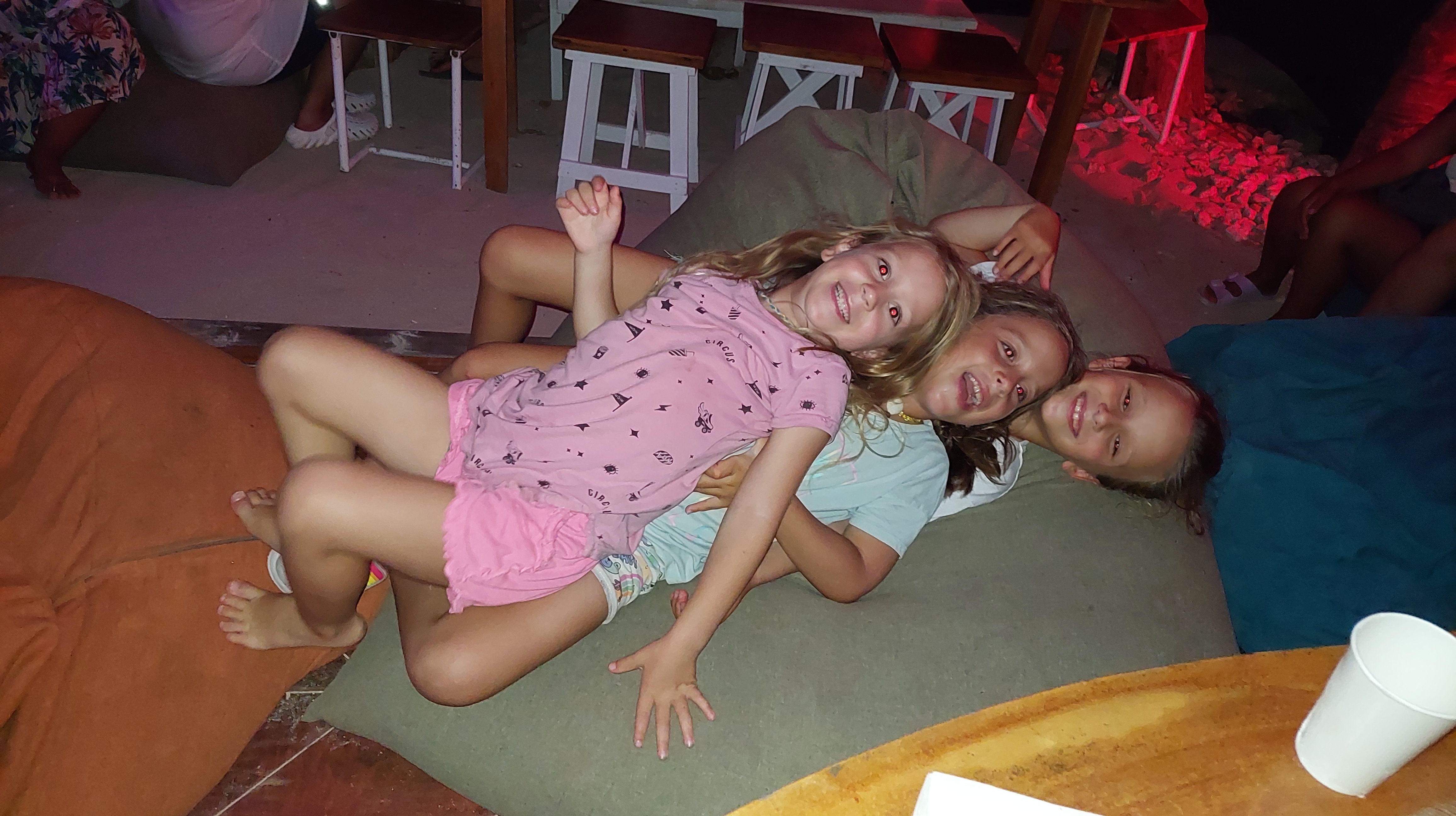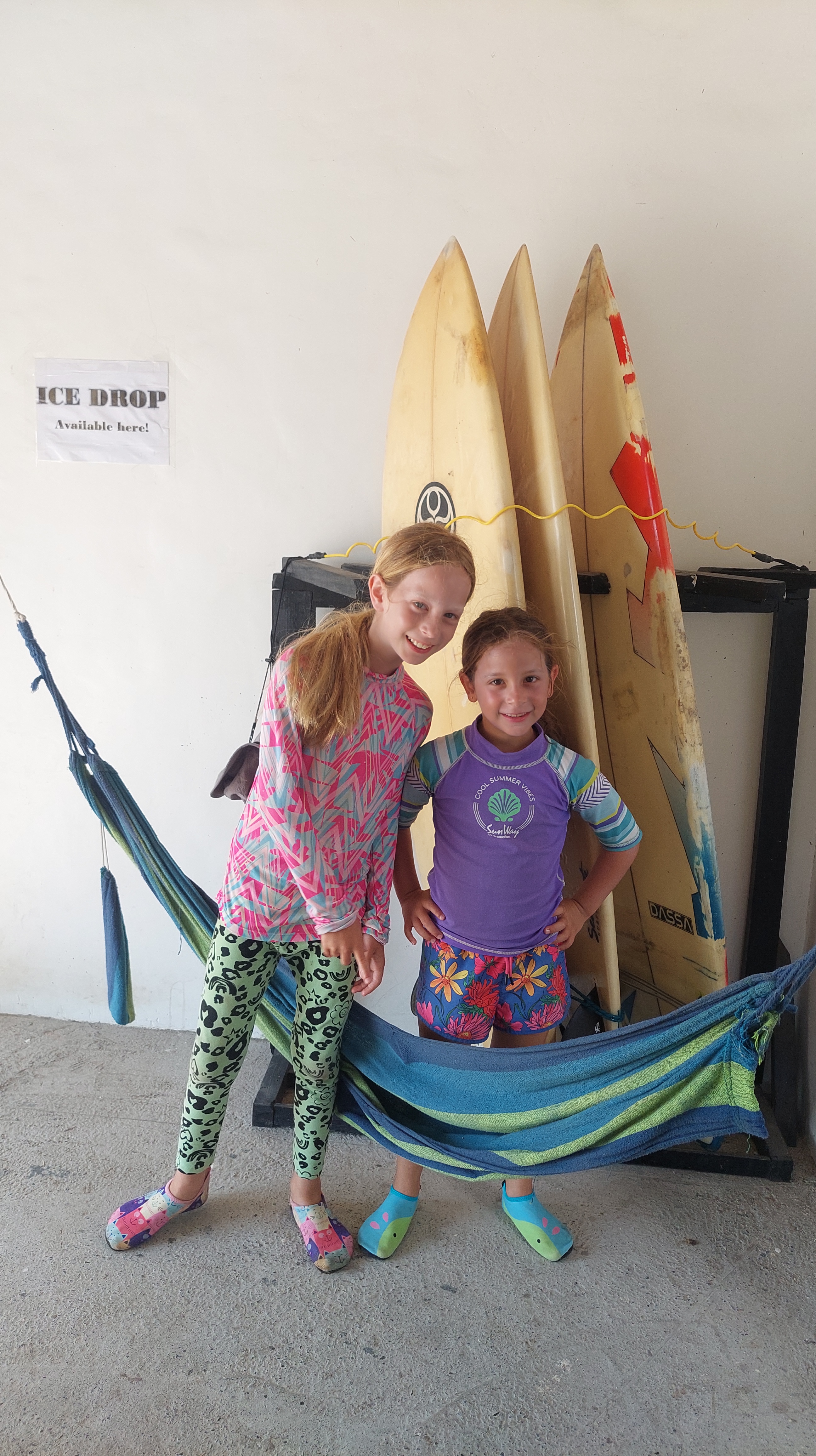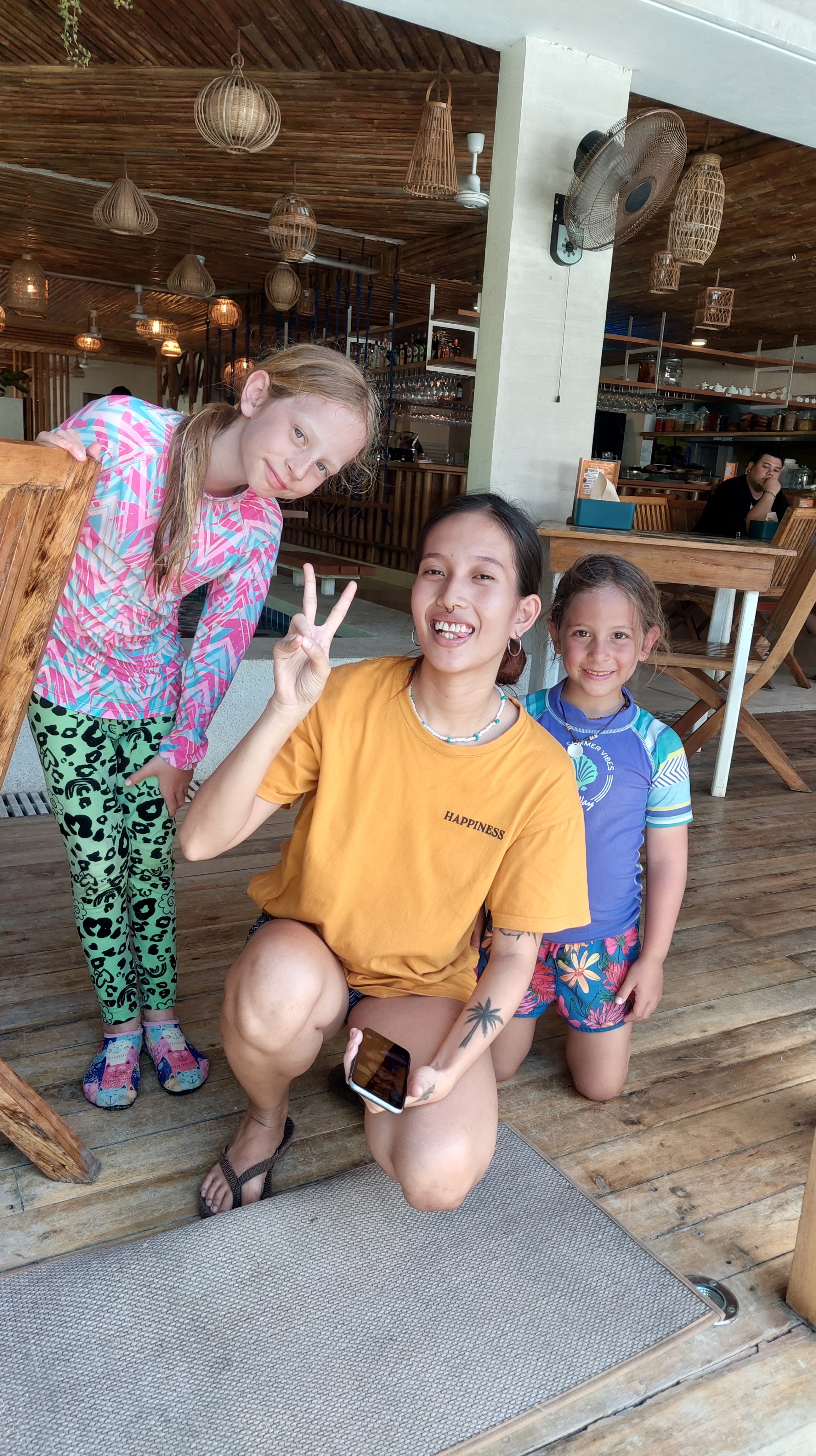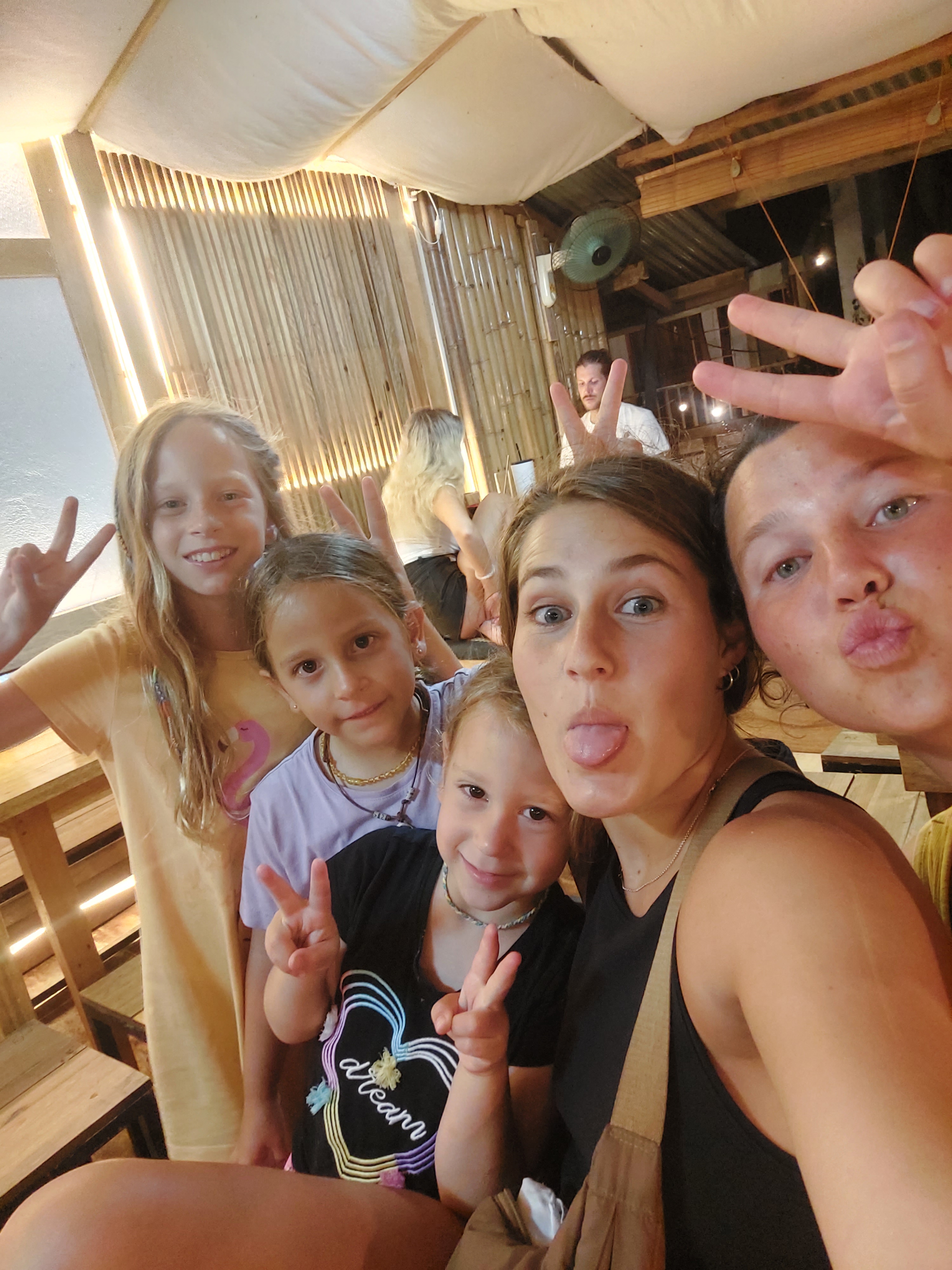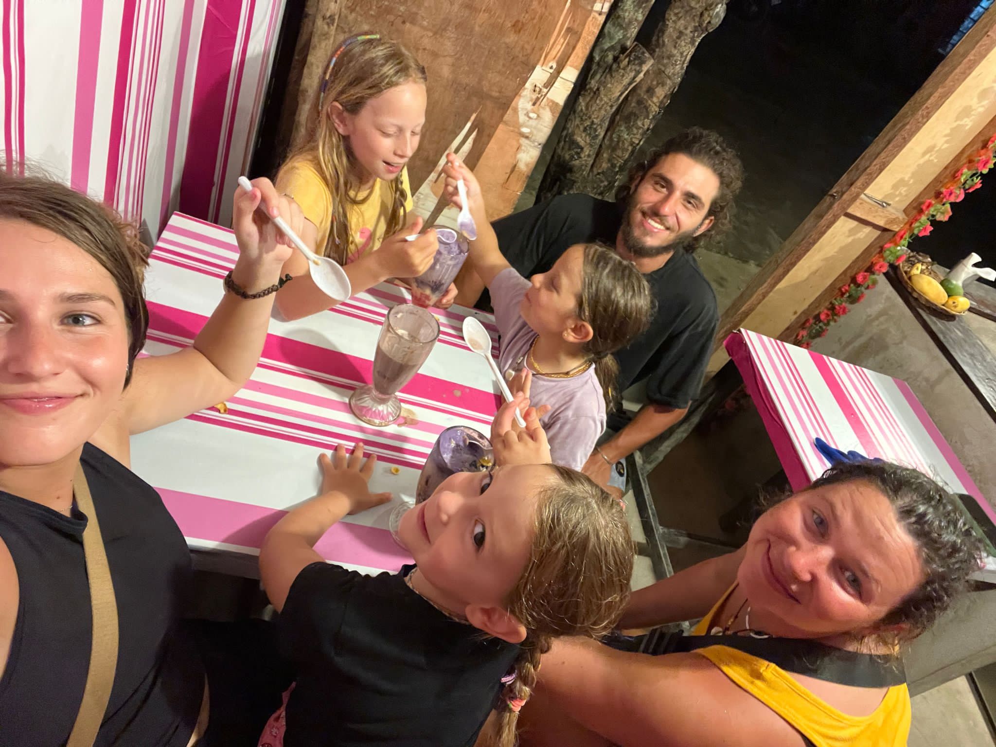 והחיבור למקומיים, למדריכי הגלישה המדהימים שאני עדיין בקשר איתם, לעובדי המלון, המסעדות, אפילו נהגי הטרייסיקל, העובדת במסעדה שעברנו בה בדרך והייתה רצה לחבק ולנשק את הילדות, כולם כבר זיהו אותנו ואנחנו הרגשנו חלק… הרגשנו בית… הרגשנו אהובות ומחוברות. אנשים שם עם לב פתוח, כל אחד שאני רק שואלת לשמו מספר ומשתף על חייו, שואל, מתעניין, פותח את ליבו וביתו. הרגשנו חיבור אמיתי. גם לתרמילאים המהממים שהכרנו, שלקחו את הילדות לאכול קינוח מקומי, שיחקו איתן, דיברו איתן, התעניינו, כולנו הסתדרנו כל כך טוב ביחד. ובשישי הייתה קבלת שבת משותפת ומרגשת.