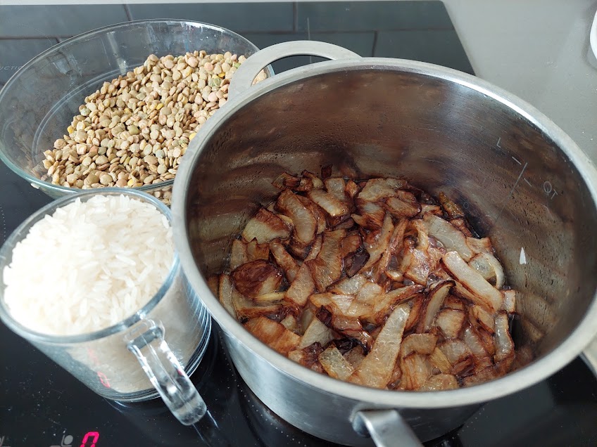 מוציאים את הבצל והשמן לקערה בצד. שופכים את העדשים לסיר ומכסים במים (מים ממש קצת מעל העדשים), מרתיחים, מנמיכים את החום ומבשלים עד שהמים מתאדים והעדשים מתרככים מעט. בינתיים שוטפים היטב את האורז.