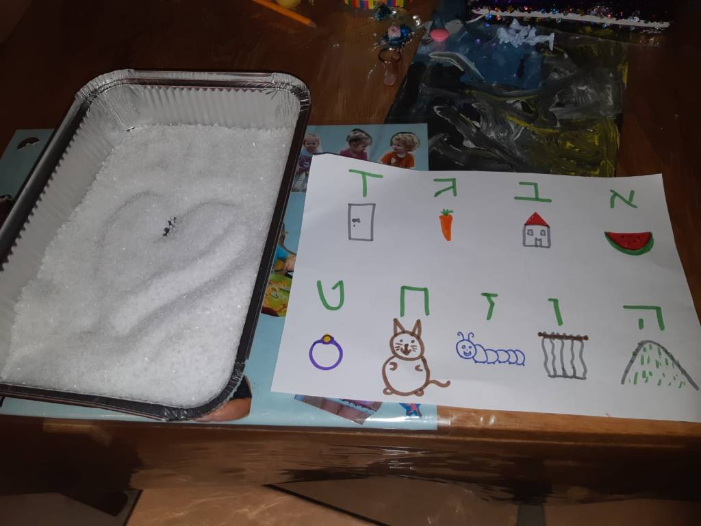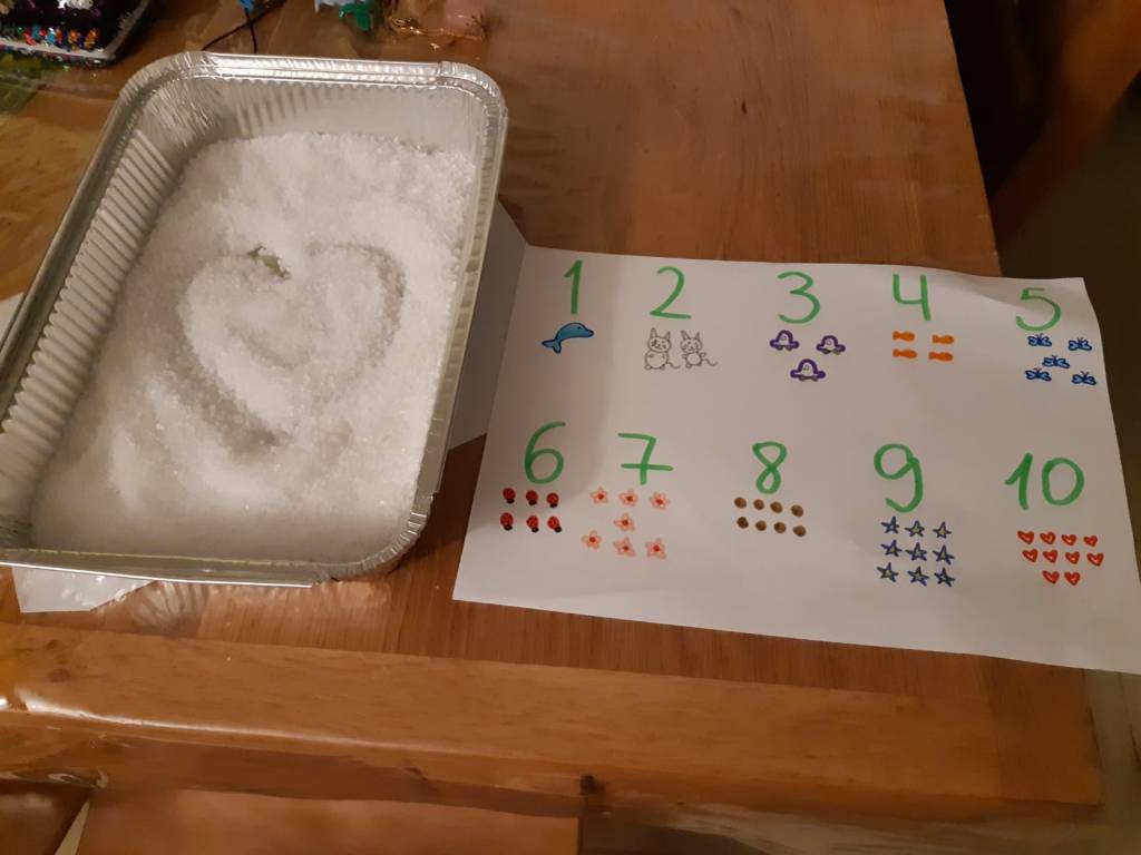 את הבוקר של יום מלח אני פותחת עם מגש מלא במלח לכל אחת, מלח שולחן רגיל. עם המלח אני עושה כל מיני משחקים. אני מניחה בכל פעם משהו אחר: אם זה מגש שקוף כמו פיירקס אז אני שמה מתחת למגש דף עם אותיות מסתתרות שצריך לקרוא, או מילים, או ציורים, או תרגילי חשבון, כדי למצוא אותם צריך להזיז את המלח באמצעות מברשת או כף. אני שמה במלח כל מיני דמויות קטנות שקיבלנו בביצות הפתעה, וזה הופך להיות משחק דמיון בשלג, אני שמה להן כפות, כוסות, והן כבר מוצאות איך לשחק במלח, אני שמה להן ליד המגש רשימה של אותיות או מספרים והן כותבות על המלח באמצעות האצבע.