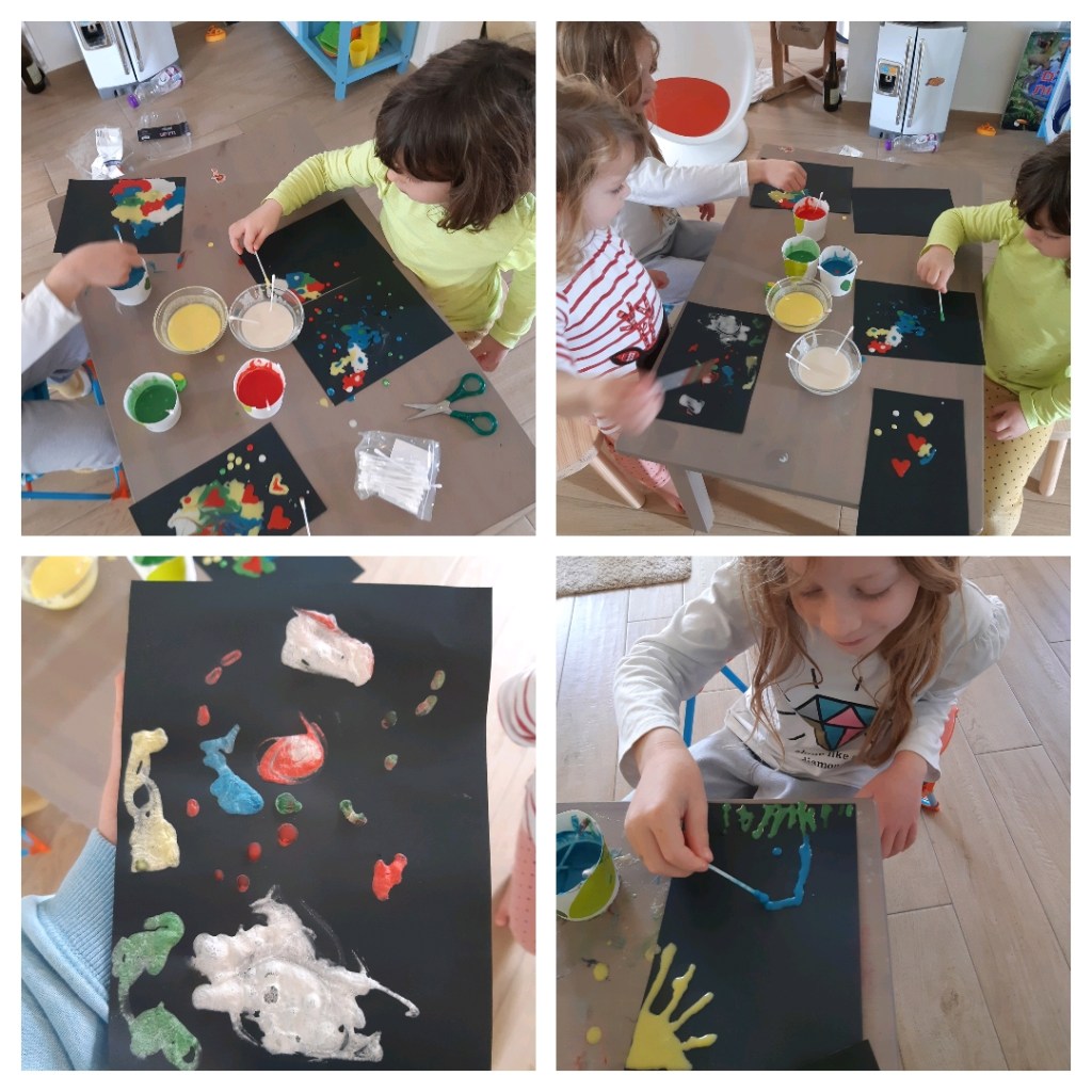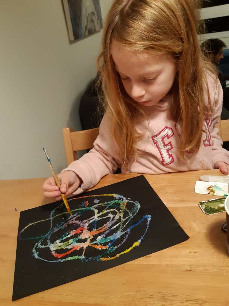 כשמיצינו את המשחק במלח (אצלנו זה לוקח לפחות שעה) עושים ציורי מלח עם צבעי מים, זה אחד הדברים האהובים עליי! כמו שהיינו עושים ציורים חול כשהיינו קטנים, אותו רעיון רק משודרג. מציירים עם דבק פלסטי על בריסטול איפה שרוצים שהמלח ידבק, אני ממליצה לעבוד על בריסטול שחור, זה הרבה יותר יפה ובולט. לאחר מכן מפזרים על הכל מלח ואז שופכים את המלח שלא נדבק. נותנים לדבק להתייבש ומתחילים ליהנות מהקסם. לוקחים צבעי מים, עדיף איכותיים, עם מכחול צובעים את המלח, המלח סופג את הנוזל והצבע מתפשט על המלח, זה יוצא צבעוני ומיוחד מאוד, מאוד מהנה עבור הילדים לצבוע ככה. ממליצה גם לכם ההורים לצייר במלח, זה כיף אדיר.