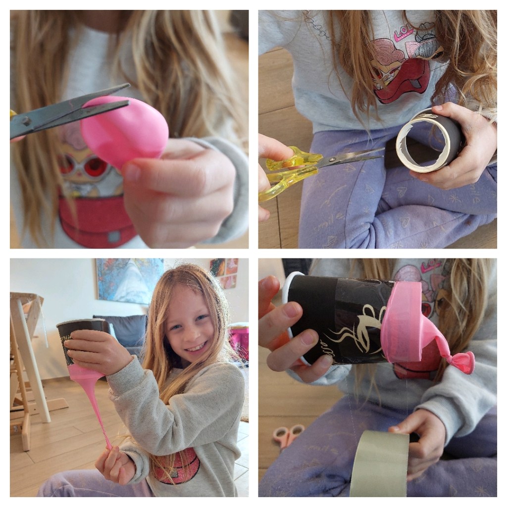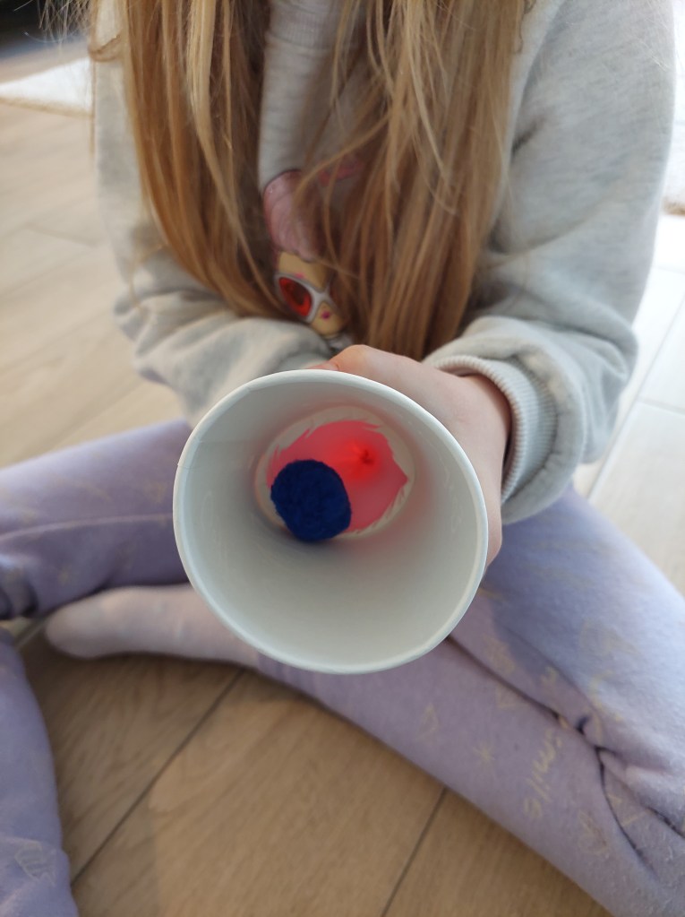 משחק העפת פונפון או כדור ותפיסתו מה צריך? כוס חד פעמית מנייר (עדיף קשיחה), פונפון גדול/ כדור קלקר/ כדור פלסטיק קל, בלון, מסקינגטייפ. הכנה יחד עם הילדים: חותכים את החלק התחתון של הכוס כך שהכוס תהיה כמו גליל, קושרים את פיית הבלון, גוזרים את הצד הסגור העגול של הבלון, כך שיוכל להתלבש על הכוס בצד שגזרתם אותה (הצד הצר יותר), מלבישים את הבלון על הכוס, עוטפים את החיבור בין הבלון לכוס עם מסקינגטייפ. זהו! המשחק מוכן. אפשר לתת לילדים לקשט את הכוס בטושים ומדבקות. שמים בתוך הכוס כדור, מושכים את הבלון איפה שקשרתם וכאשר עוזבים את הקשירה הכדור עף למעלה ומנסים לתפוס אותו עם הכוס. זה מלמד את הילדים שככל שימשכו חזק יותר את הבלון, כך הכדור יעוף גבוה יותר, ויהיה קשה יותר לתפוס אותו, זה עוזר להם לווסת את הכוח שלהם.