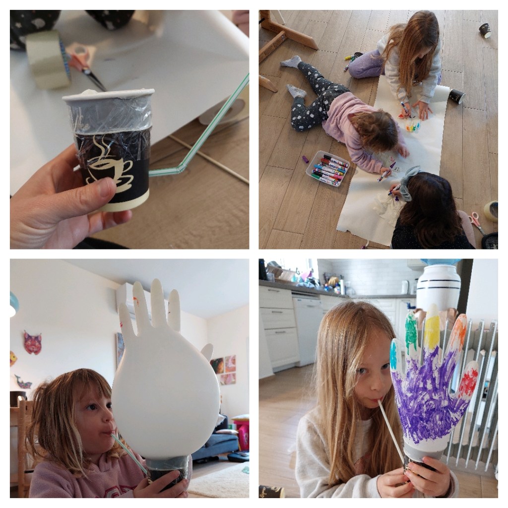 ניפוח כפפה מה צריך? כוס חד פעמית מנייר, כפפה חד פעמית, קשית מתקפלת, מסקינגטייפ, טושים לא מחיקים לקישוט. הכנה: נותנים לילדים לקשט את הכפפה, אפשר לעשות על הכפפה פרצוף, או כל מה שרוצים. בזמן שהם מקשטים, אתם עושים בכוס בצד שלה באזור נמוך, קרוב לתחתית חור (אני עושה בעזרת עט) כמה שיותר קטן, אך שקשית תוכל להיכנס אליו, מכניסים לחור קצת מהקשית בצד הקרוב יותר לקיפול של הקשית. כאשר מסיימים לקשט את הכפפה עוטפים בכפפה את החלק העליון הפתוח של הכוס ומדביקים מסביב במסקינגטייפ. מכניסים את שארית הכפפה לתוך הכוס ונותנים לילדים לנשוף בקשית. מה קורה? הכפפה מתנפחת ועולה למעלה. עבור ילדים קטנים זה ממש פלא, זה מצחיק אותם לראות איך כשהם נושפים הכפפה עולה מול עיניהם. בנוסף, זה מלמד אותם שכשמפסיקים לנשוף הכפפה יורדת, והם יכולים לעצור זאת ולהשאיר את הכפפה מנופחת באמצעות סגירת הקשית עם האצבע.