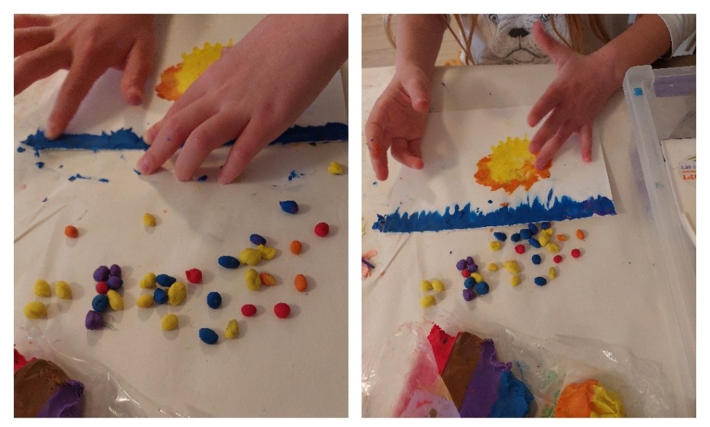 משחק באורז צבעוני: יום לפני אני שמה אורז מחולק לשקיות עם כמה טיפות צבע מאכל בכל שקית (יש לי צבעי מאכל בבית רק לצורך יצירה, ממליצה על ג'ל, הצבעים יותר חזקים), וכפית אלכוהול. מערבבת היטב את השקית, ושופכת בכלי גדול צבע לצד צבע. מגישה את זה במגש הגדול עם כלי משחק כמו כוסות, כפות, מכוניות, וכו'… הילדות כבר מוצאות מה לעשות עם זה, שעות של הנאה. גם כשהצבעים מתערבבים אנחנו משאירות את מגש האורז בחוץ מכוסה ומידיי פעם מוציאים אותו למשחק, כמו משחק בחול. אפשר גם לעשות מהאורז ציור (כמו עם חול ועם מלח, מציירים עם דבק פלסטי, על זה שופכים את האורז והאורז נדבק איפה שיש דבק). כשעשיתי את המשחק הזה בתוך הבית ביום גשום, הוספתי למשחק גם נקיון, הבאתי להן מברשות עם יעה וההנאה מהנקיון הייתה גדולה.