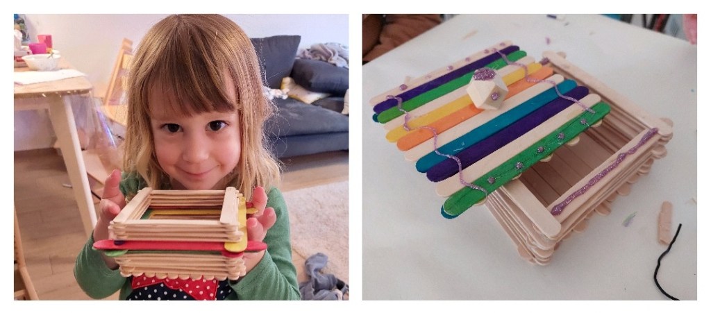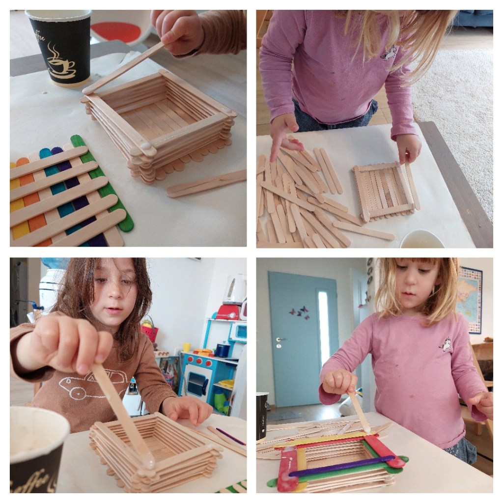 בניית קופסה ממקלות ארטיק פעילות פשוטה וכל כך מהנה ומספקת. מה צריך: המון מקלות ארטיק, דבק פלטי. איך מכינים: מתחילים מהתחתית. לתחתית מניחים מקלות ארטיק צמודים זה לזה, כמות ששווה לאורך של מקל ארטיק. לאחר מכן מדביקים לרוחב משני צידי המשטח שיצרנו שני מקלות ארטיק (שמים דבק פלסטי לאורך כל המקל, כך שהמקלות הללו ידביקו את כל המשטח שיצרנו מחובר), כדאי לתת לזה קצת זמן להתייבש כדי שלא יתפרק ואז להתחיל לעבוד בעדינות. מפה העבודה ממש פשוטה, כל פעם שמים קצת דבק בארבע הפינות ומדביקים שני מקלות ארטיק, פעם לאורך ופעם לרוחב. עד שזה מגיע לגובה הרצוי. לאחר מכן ניתן להכין מכסה, לא חייבים, רק אם רוצים. את המכסה מכינים בדומה לתחתית. יוצרים משטח של מקלות זה לצד זה, ואז מדביקים מקלות לרוחב, כדאי יותר מ2 כדי שיהיה חזק. לאחר מכן ניתן להוסיף ידית למעלה ממקל ארטיק שבור לחתיכות קטנות מודבקות זו לזו, או מחרוז מודבק. אפשר לצבוע את הקופסה והמכסה, או להשאיר בצבע המקלות הטבעי. אנחנו השתמשנו עבור המכסה במקלות ארטיק צבעוניים וקישטנו בטוליפ נוצץ.
