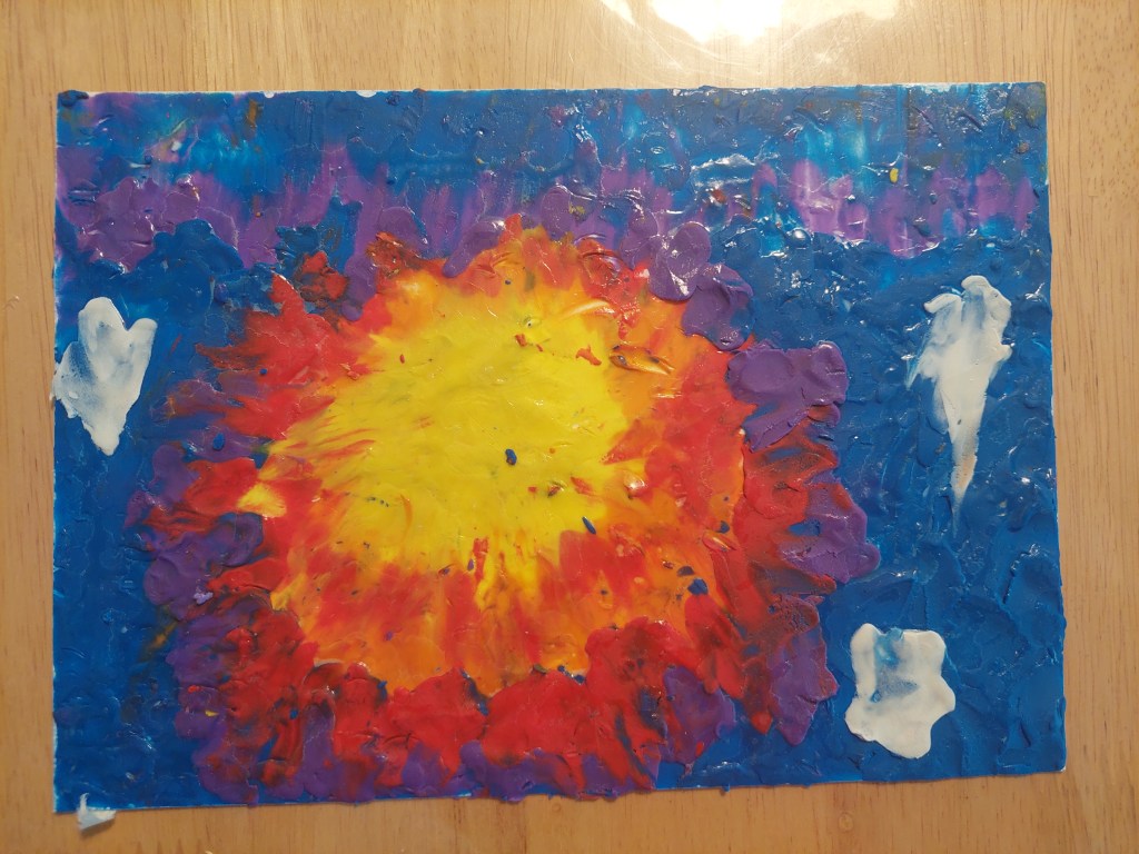 ציור בבועות סבון: מערבבים בכוסות סבון עלים ומים, לכל כוס מוסיפים כמה טיפול צבע מאכל. לוקחים קשים, טובלים במי הסבון ואז מנפחים את הבועות על הדף. בועה אחר בועה, כשהבועה מתנפצת על הדף זה משאיר סימן, כשעושים הרבה בועות צבעוניות על הדף זה כיף ומדליק.