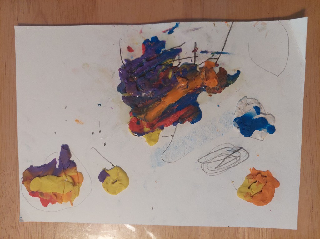 ציור בפלסטלינה אחד הדברים שאני הכי אוהבת לעשות עם פלסטלינה, יותר מלפסל, זה לצייר. משהו במריחה שלה, בצבעים שמתערבבים יוצא יפה, מעניין ובלתי צפוי. מה צריך: פלסטלינה, משטח עבודה קשיח (בריסטול קשיח/ קרטון ביצוע/ קרטון רגיל/ אריזת קורנפלקס וכו'), דבק פלסטי. איך מכינים? יש כל מיני אפשרויות, אפשר קודם לצייר סקיצה בעפרון ואת זה למלא בפלסטלינה, אני הכי אוהבת פשוט לעבוד ולזרום עם מה שיוצא. חלק מהכיף בפלסטלינה זה שתמיד אפשר לתקן, אפשר למרוח עוד שכבה, או להוציא את הפלסטלינה, כך שלא חייבים לתכנן. מה שכן כדאי מאוד לפני שמתחילים לעבוד, בעיקר עבור הילדים, זה להכין כדורי פלסטלינה קטנים בכל הצבעים, פשוט צובטים את פלסטלינה ומגלגלים אותה בין האצבעות לכדור קטן, כך היא מתחממת ומתרכך והרבה יותר נעים ונוח לעבוד איתה ככה. ילדים צעירים יכולים לקחת את הכדורים ופשוט למעוך אותם על הדף, ילדים בוגרים יותר ימרחו את זה וישלבו צבעים. כשמסיימים לצייר מורחים על הכל דבק פלסטי, כשהוא מתייבש הדבק נהיה שקוף והתמונה מבריקה ויפה.