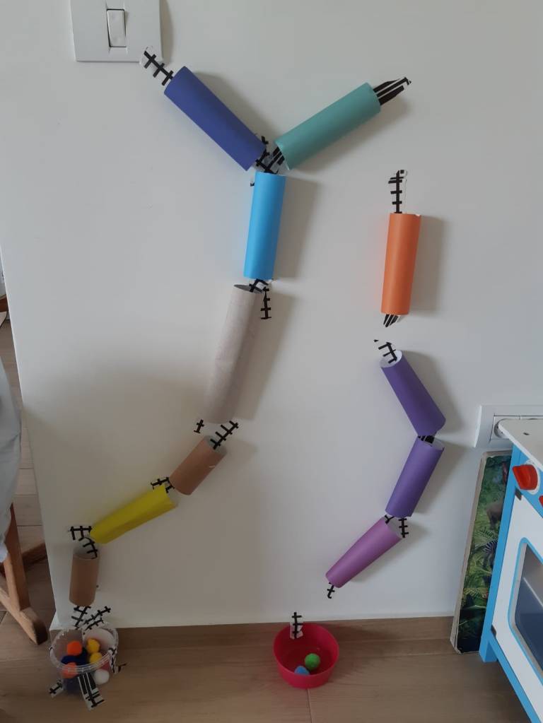 מסלול פונפונים פעילות נחמדה. גדולים יכולים להכין בעצמם, לקטנטנים אפשר להכין מראש והם יהנו לשחק בזה. מה צריך: פונפונים, גלילי נייר, וושיטייפ חלש, קעריות או סלסלות לקצה המסלול. כמו שניתן לראות בתמונה, אפשר להרכיב מסלולים שונים מגלילים. גלילי נייר טואלט, או הכנת גלילים מנייר רגיל. כדאי להדביק עם וושיטייפ חלש שלא מוריד צבע מהקיר.